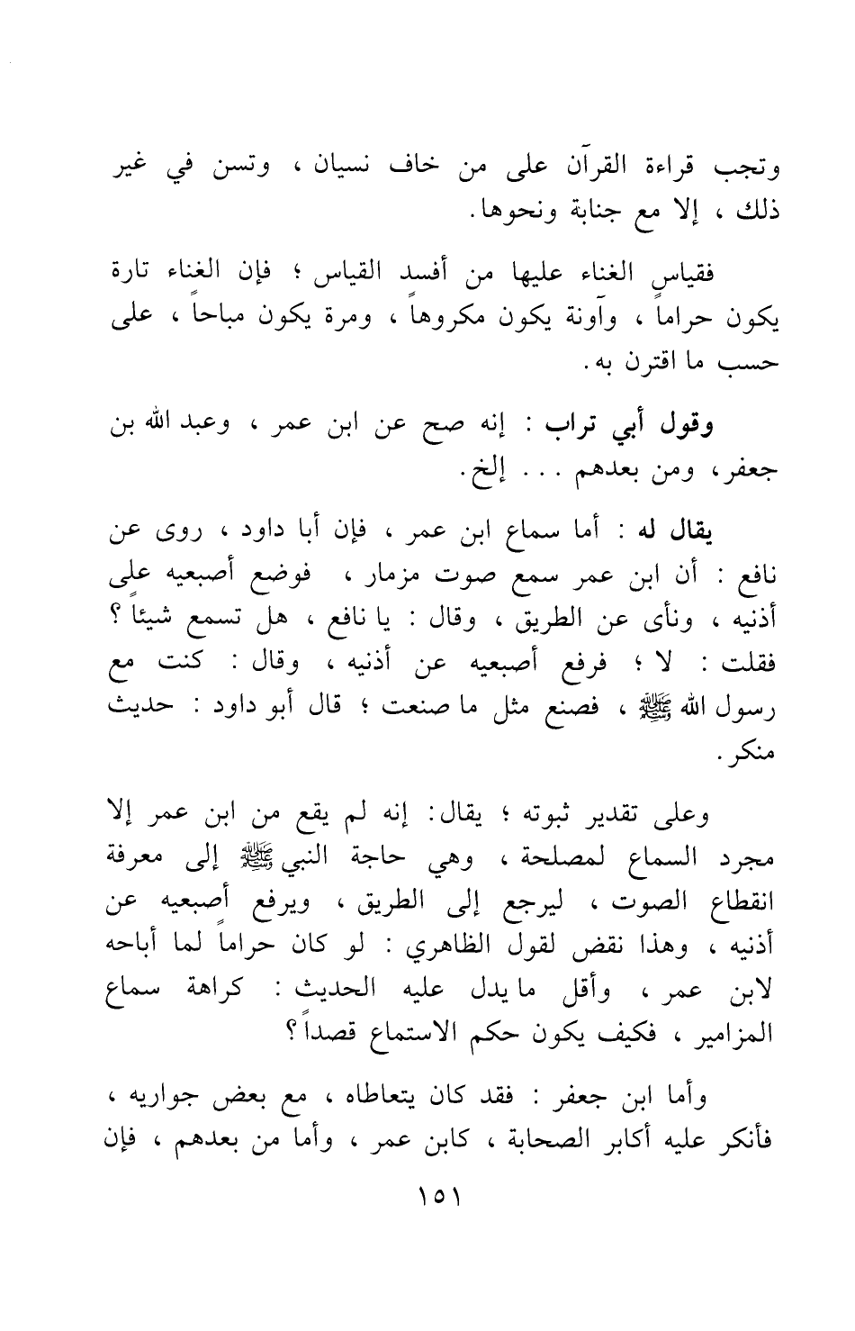 يقال له: أما سماع ابن عمر، فإن أبا داود، روى عن نافع: أن "ابن عمر سمع صوت مزمار، فوضع أصبعيه على أذنيه، ونأى عن الطريق، وقال: يا نافع، هل تسمع شيئا؟ فقلت: لا، فرفع أصبعيه عن أذنيه، وقال: كنت مع رسول الله صلى الله عليه وسلم فصنع مثل ما صنعت" 1 قال أبو داود. حديث منكر.