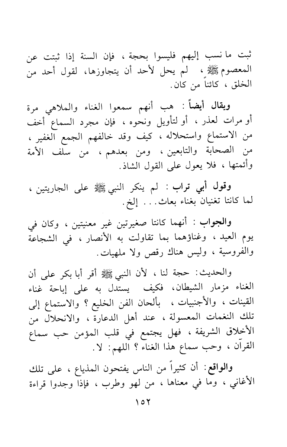 والحديث حجة لنا، لأن النبي صلى الله عليه وسلم أقر أبا بكر على أن الغناء مزمار الشيطان، فكيف يستدل به على إباحة غناء القينات، والأجنبيات، بألحان الفن الخليع؟ والاستماع إلى تلك النغمات المعسولة، عند أهل الدعارة، والانحلال من الأخلاق الشريفة؟ فهل يجتمع في قلب المؤمن حب سماع القرآن، وحب سماع هذا الغناء؟ اللهم لا.