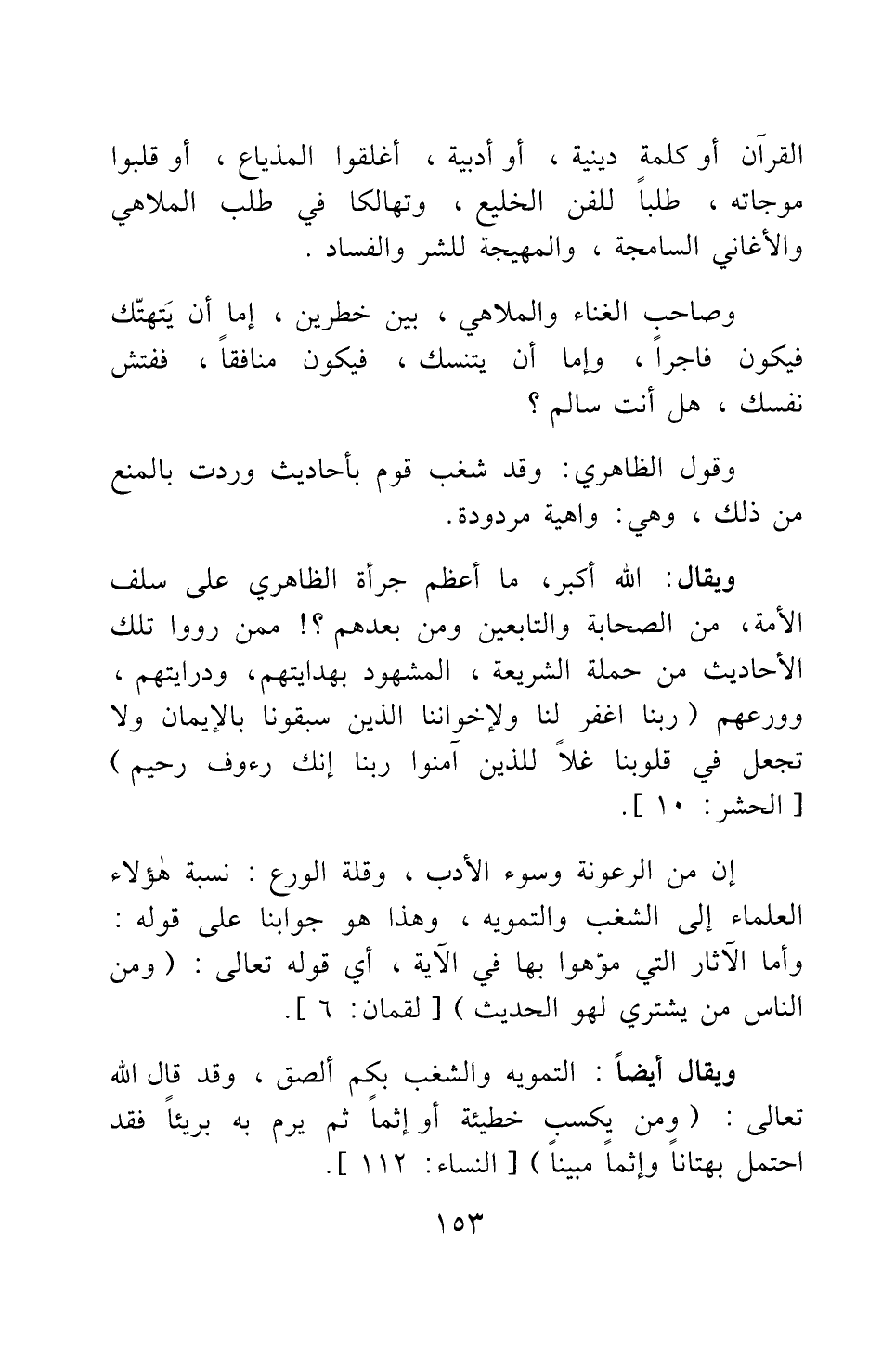 وصاحب الغناء والملاهي بين خطرين: إما أن يتهتك فيكون فاجرا، وإما أن يتنسك، فيكون منافقا، ففتش نفسك، هل أنت سالم؟