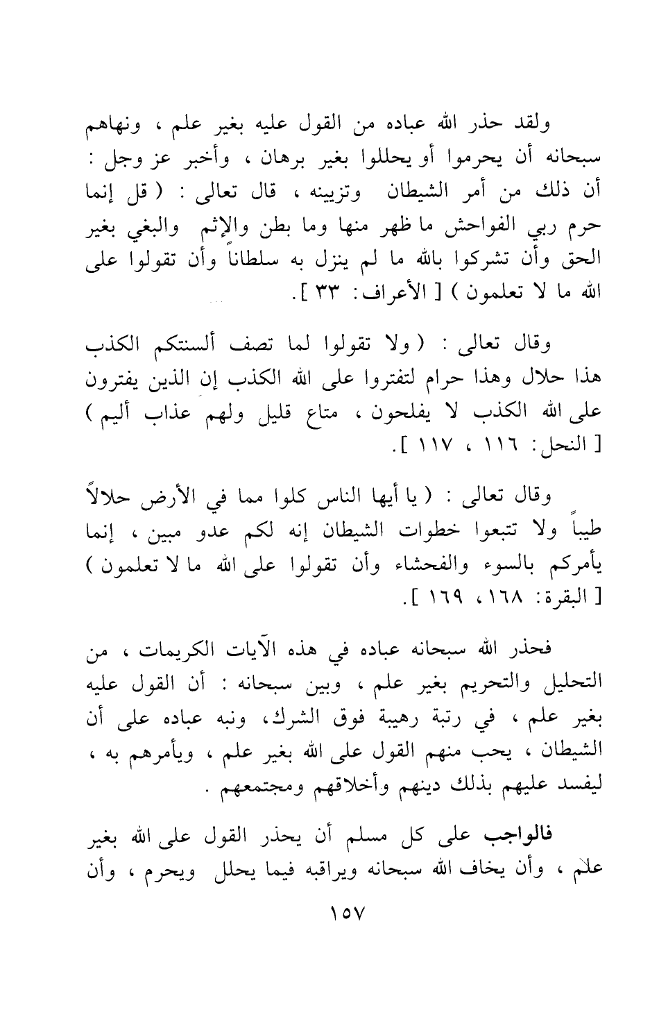 وقال تعالى: {وَلا تَقُولُوا لِمَا تَصِفُ أَلْسِنَتُكُمُ الْكَذِبَ هَذَا حَلالٌ وَهَذَا حَرَامٌ لِتَفْتَرُوا عَلَى اللَّهِ الْكَذِبَ إِنَّ الَّذِينَ يَفْتَرُونَ عَلَى اللَّهِ الْكَذِبَ لا يُفْلِحُونَ مَتَاعٌ قَلِيلٌ وَلَهُمْ عَذَابٌ أَلِيمٌ} [سورة النحل آية: 116-117] . وقال تعالى: {يَا أَيُّهَا النَّاسُ كُلُوا مِمَّا فِي الْأَرْضِ حَلالاً طَيِّباً وَلا تَتَّبِعُوا خُطُوَاتِ الشَّيْطَانِ إِنَّهُ لَكُمْ عَدُوٌّ مُبِين ٌإِنَّمَا يَأْمُرُكُمْ بِالسُّوءِ وَالْفَحْشَاءِ وَأَنْ تَقُولُوا عَلَى اللَّهِ مَا لا تَعْلَمُونَ} [سورة البقرة آية: 168-169] . فحذر الله سبحانه عباده في هذه الآيات الكريمات، من التحليل والتحريم بغير علم، وبين سبحانه: أن القول عليه بغير علم، في رتبة رهيبة فوق الشرك، ونبه عباده على أن الشيطان يحب منهم القول على الله بغير علم، ويأمرهم به ليفسد عليهم بذلك دينهم وأخلاقهم ومجتمعهم.