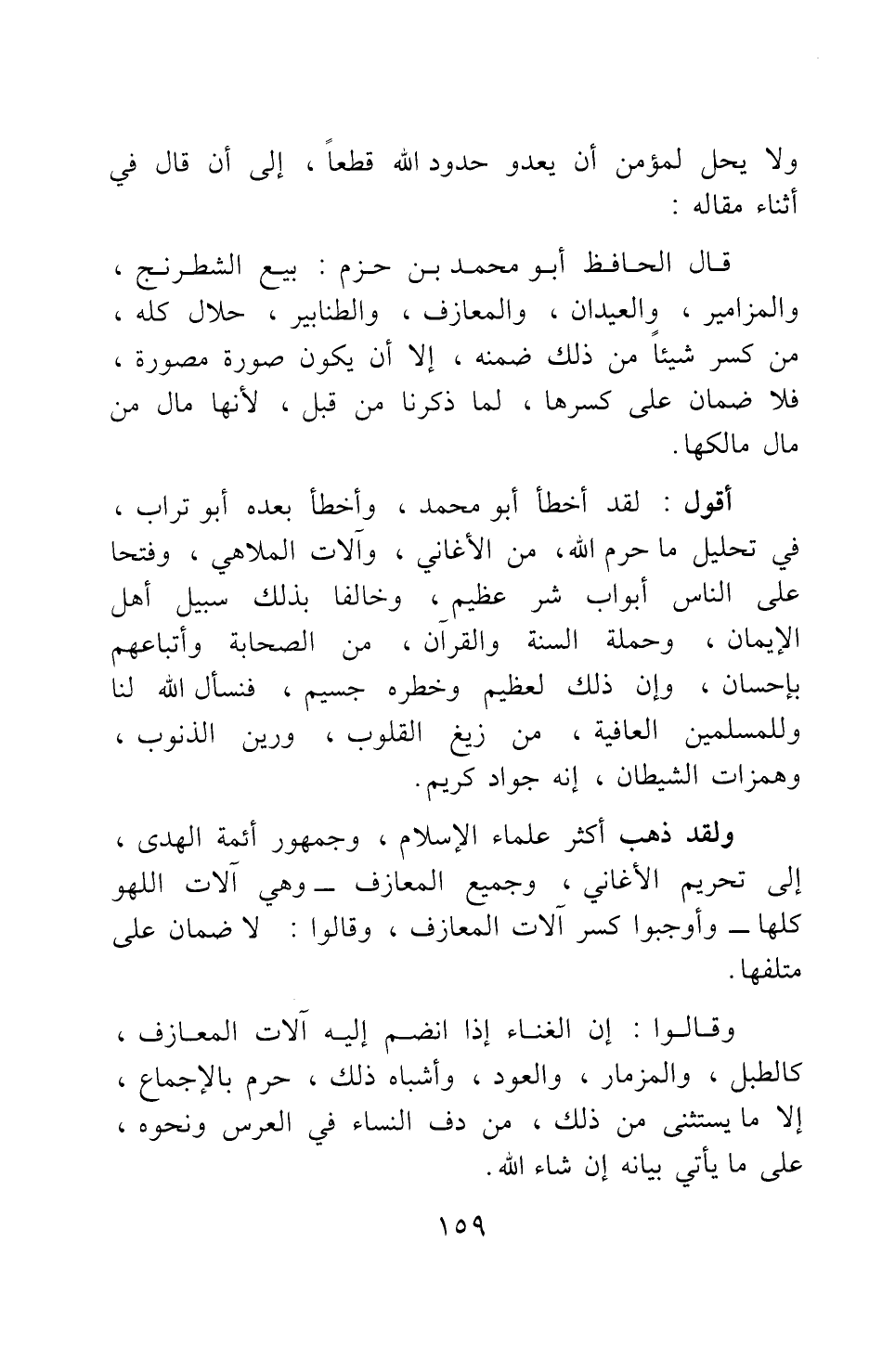 ولقد ذهب أكثر علماء الإسلام، وجمهور أئمة الهدى، إلى تحريم الأغاني، وجميع المعازف- وهي آلات اللهو كلها- وأوجبوا كسر آلات المعازف، وقالوا: لا ضمان على متلفها.