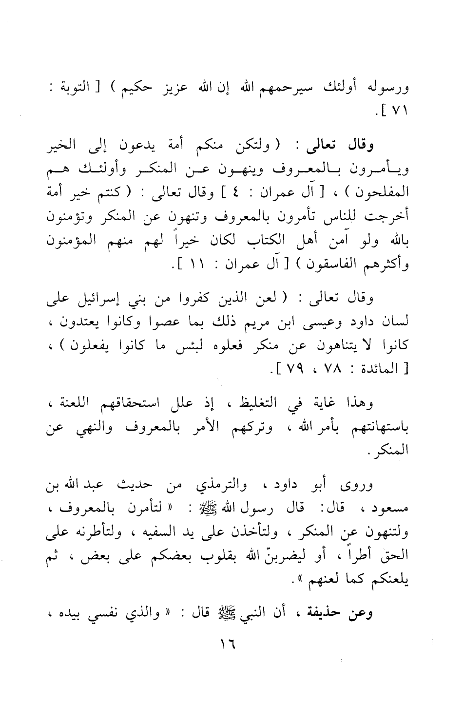 وقال تعالى: {كُنْتُمْ خَيْرَ أُمَّةٍ أُخْرِجَتْ لِلنَّاسِ تَأْمُرُونَ بِالْمَعْرُوفِ وَتَنْهَوْنَ عَنِ الْمُنْكَرِ وَتُؤْمِنُونَ بِاللَّهِ وَلَوْ آمَنَ أَهْلُ الْكِتَابِ لَكَانَ خَيْراً لَهُمْ مِنْهُمُ الْمُؤْمِنُونَ وَأَكْثَرُهُمُ الْفَاسِقُونَ} [سورة آل عمران آية: 110] ، وقال تعالى: {لُعِنَ الَّذِينَ كَفَرُوا مِنْ بَنِي إِسْرائيلَ عَلَى لِسَانِ دَاوُدَ وَعِيسَى ابْنِ مَرْيَمَ ذَلِكَ بِمَا عَصَوْا وَكَانُوا يَعْتَدُونَ كَانُوا لا يَتَنَاهَوْنَ عَنْ مُنْكَرٍ فَعَلُوهُ لَبِئْسَ مَا كَانُوا يَفْعَلُونَ} [سورة المائدة آية: 78-79]