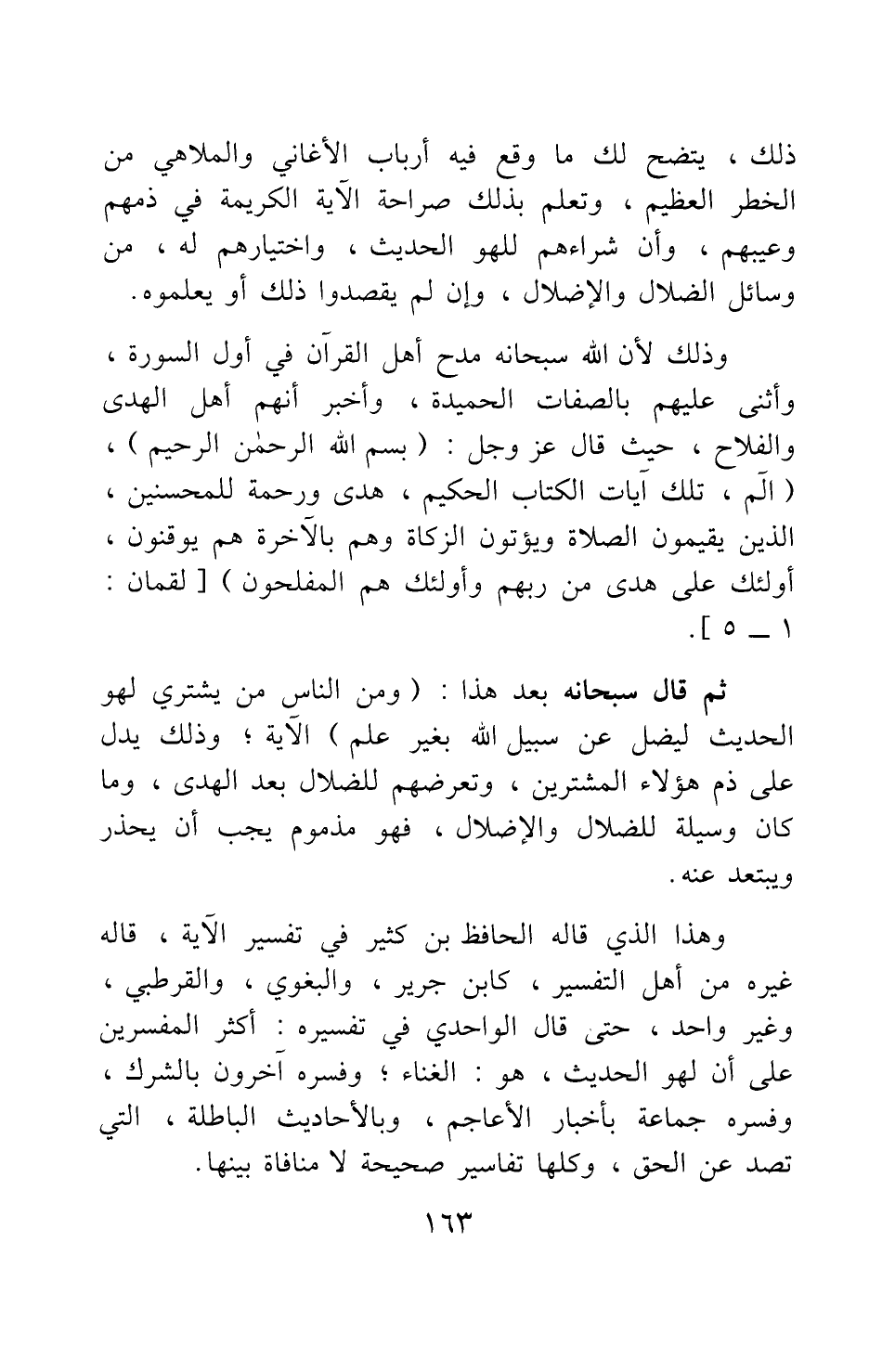 ذلك، يتضح لك ما وقع فيه أرباب الأغاني والملاهي؛ فإن الخطر العظيم؛ وتعلم بذلك صراحة الآية الكريمة في ذمهم وعيبهم، وأن شراءهم للهو الحديث، واختيارهم له، من وسائل الضلال والإضلال، وإن لم يقصدوا ذلك أو يعلموه.