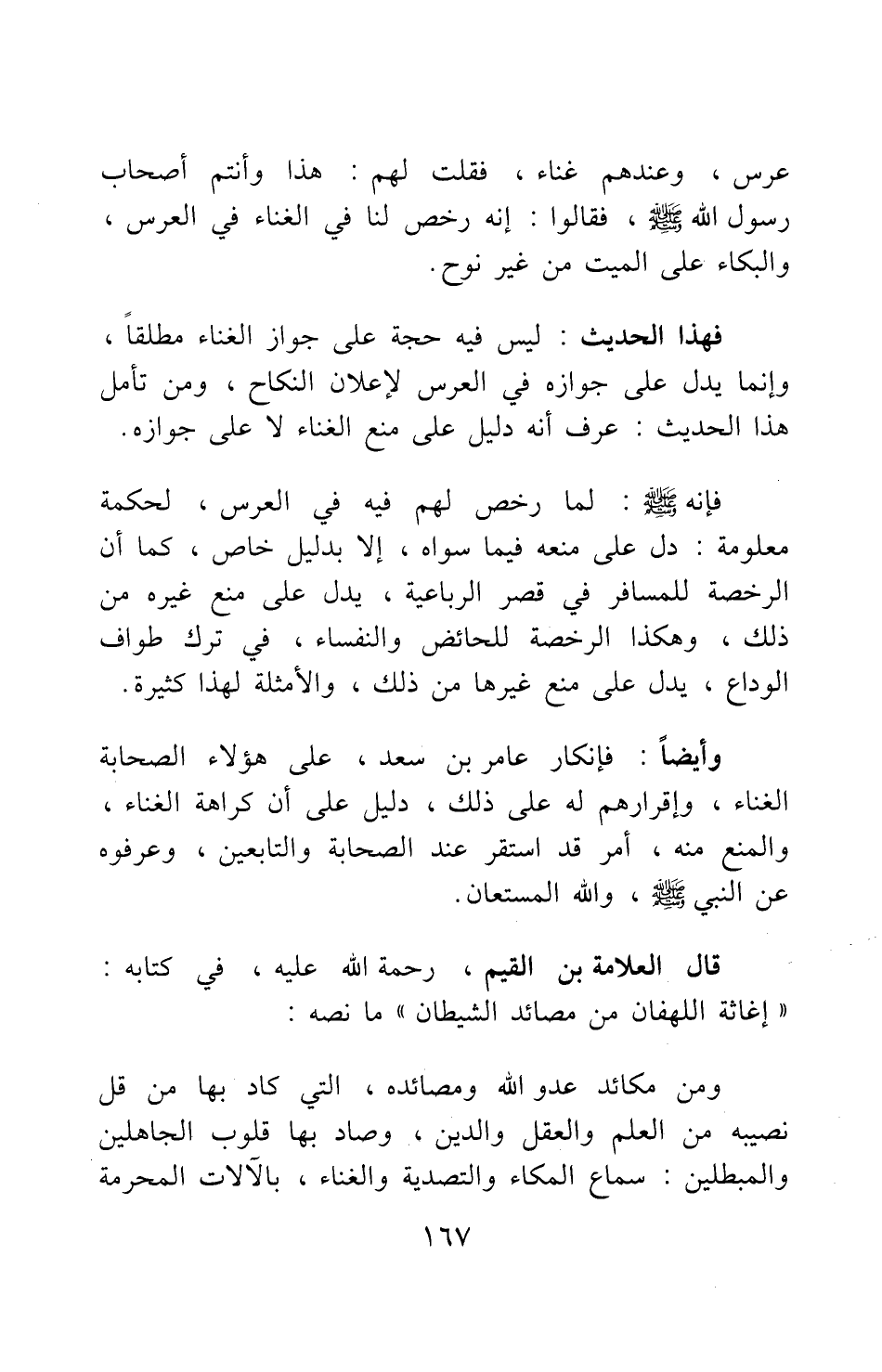 فهذا الحديث ليس فيه حجة على جواز الغناء مطلقا، وإنما يدل على جوازه في العرس لإعلان النكاح؛ ومن تأمل هذا الحديث عرف أنه دليل على منع الغناء لا على جوازه.