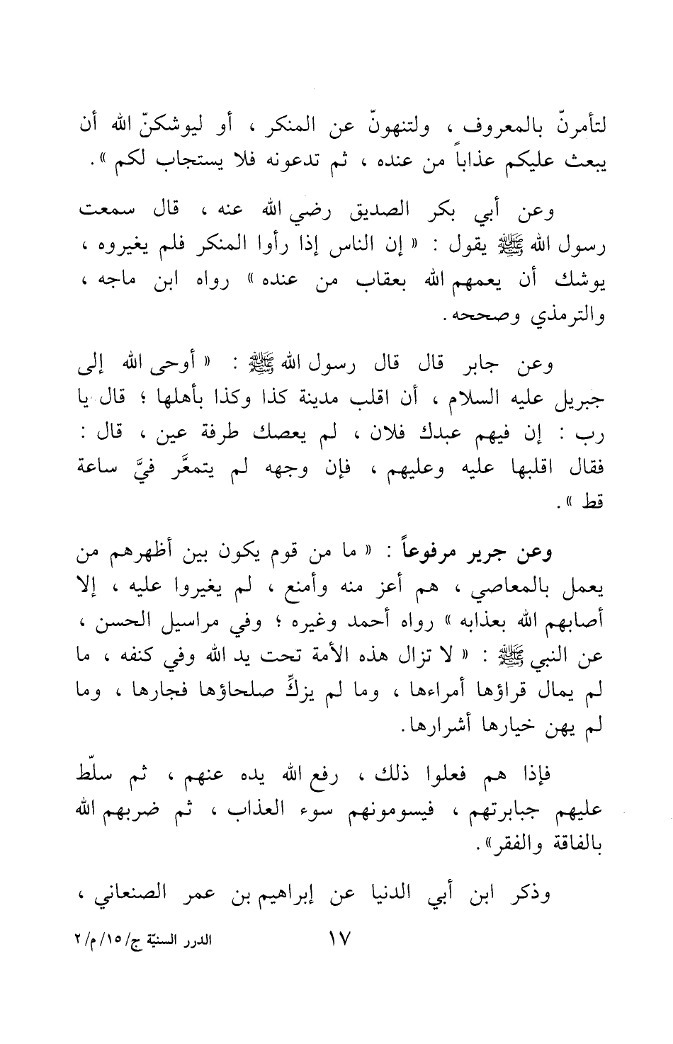 وعن أبي بكر الصديق رضي الله عنه قال: سمعت رسول الله فيه يقول: "إن الناس إذا رأوا المنكر فلم يغيروه، يوشك أن يعمهم الله بعقاب من عنده" 2 رواه ابن ماجه، والترمذي وصححه.
