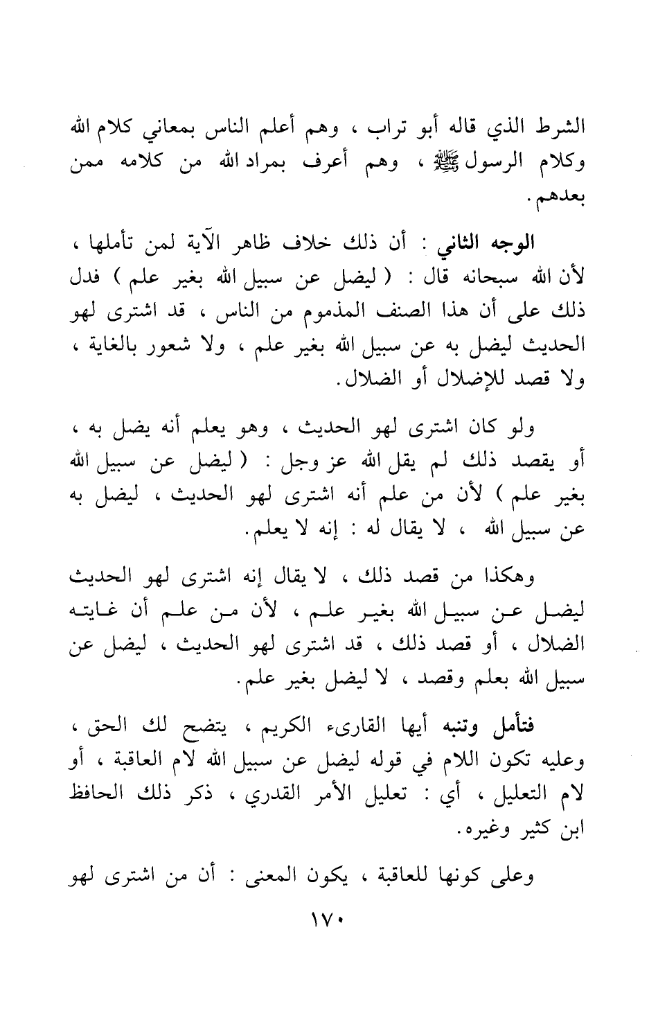 الوجه الثاني: أن ذلك خلاف ظاهر الآية لمن تأملها، لأن الله سبحانه قال: {لِيُضِلَّ عَنْ سَبِيلِ اللَّهِ بِغَيْرِ عِلْمٍ} [سورة لقمان آية: 6] , فدل ذلك على أن هذا الصنف المذموم من الناس قد اشترى لهو الحديث ليضل به عن سبيل الله بغير علم ولا شعور بالغاية، ولا قصد للإضلال أو الضلال.