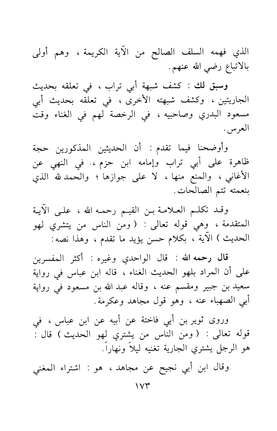قال رحمه الله: قال الواحدي وغيره: أكثر المفسرين على أن المراد بلهو الحديث الغناء، قاله ابن عباس في رواية سعيد بن جبير ومقسم عنه، وقاله عبد الله بن مسعود في رواية أبي الصهباء عنه، وهو قول مجاهد وعكرمة. وروى ثوير بن أبي فاختة عن أبيه عن ابن عباس، في قوله تعالى: ?" {وَمِنَ النَّاسِ مَنْ يَشْتَرِي لَهْوَ الْحَدِيثِ} [سورة لقمان آية: 6] قال: (هو الرجل يشتري الجارية تغنيه ليلا ونهارا".