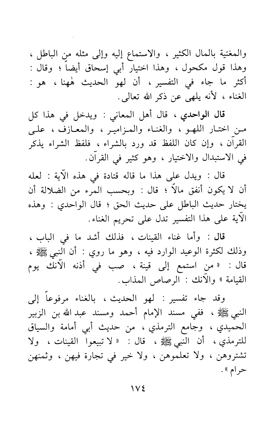 قال: ويدل على هذا ما قاله قتادة في هذه الآية: لعله أن لا يكون أنفق مالا. قال: وبحسب المرء من الضلالة أن يختار حديث الباطل على حديث الحق، قال الواحدي: وهذه الآية على هذا التفسير تدل على تحريم الغناء.