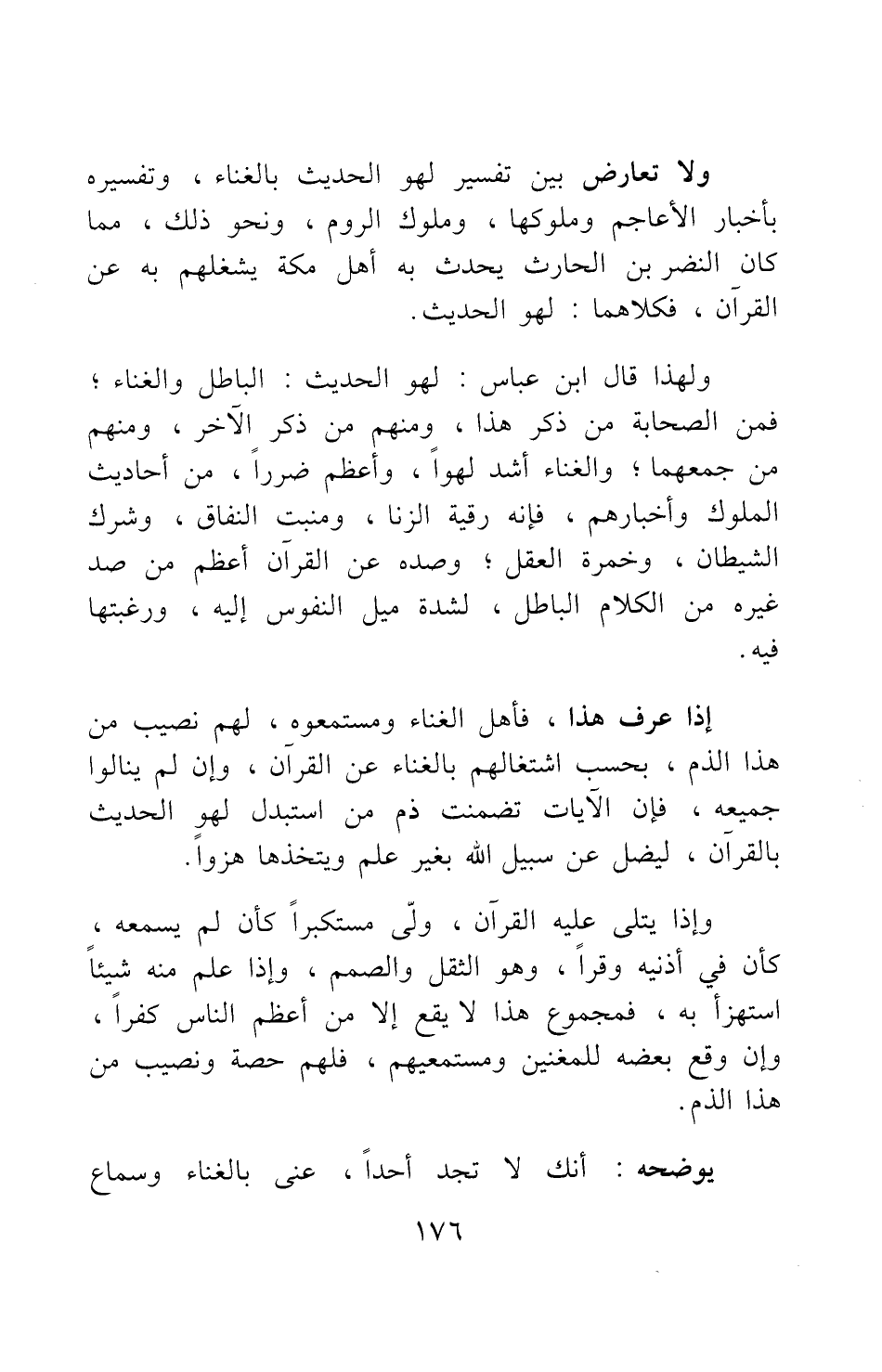ولهذا قال "ابن عباس: لهو الحديث: الباطل والغناء"، فمن الصحابة من ذكر هذا، ومنهم من ذكر الآخر، ومنهم من جمعهما. والغناء أشد لهوا، وأعظم ضررا، من أحاديث الملوك وأخبارهم، فإنه رقية الزنى، ومثبت النفاق، وشرك الشيطان، وخمرة العقل، وصده عن القرآن أعظم من صد غيره من الكلام الباطل، لشدة ميل النفوس إليه، ورغبتها فيه.