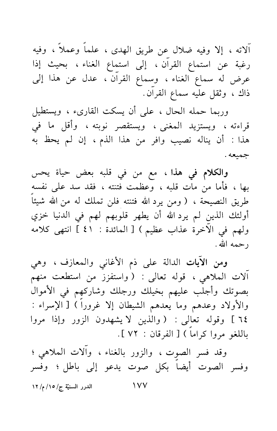 ومن الآيات الدالة على ذم الأغاني والمعازف وهي: آلات الملاهي، قوله تعالى: {وَاسْتَفْزِزْ مَنِ اسْتَطَعْتَ مِنْهُمْ بِصَوْتِكَ وَأَجْلِبْ عَلَيْهِمْ بِخَيْلِكَ وَرَجِلِكَ وَشَارِكْهُمْ فِي الْأَمْوَالِ وَالْأَوْلادِ وَعِدْهُمْ وَمَا يَعِدُهُمُ الشَّيْطَانُ إِلَّا غُرُوراً} [سورة الإسراء آية: 64] ، وقوله تعالى: {وَالَّذِينَ لا يَشْهَدُونَ الزُّورَ وَإِذَا مَرُّوا بِاللَّغْوِ مَرُّوا كِرَاماً} [سورة الفرقان آية: 72] .