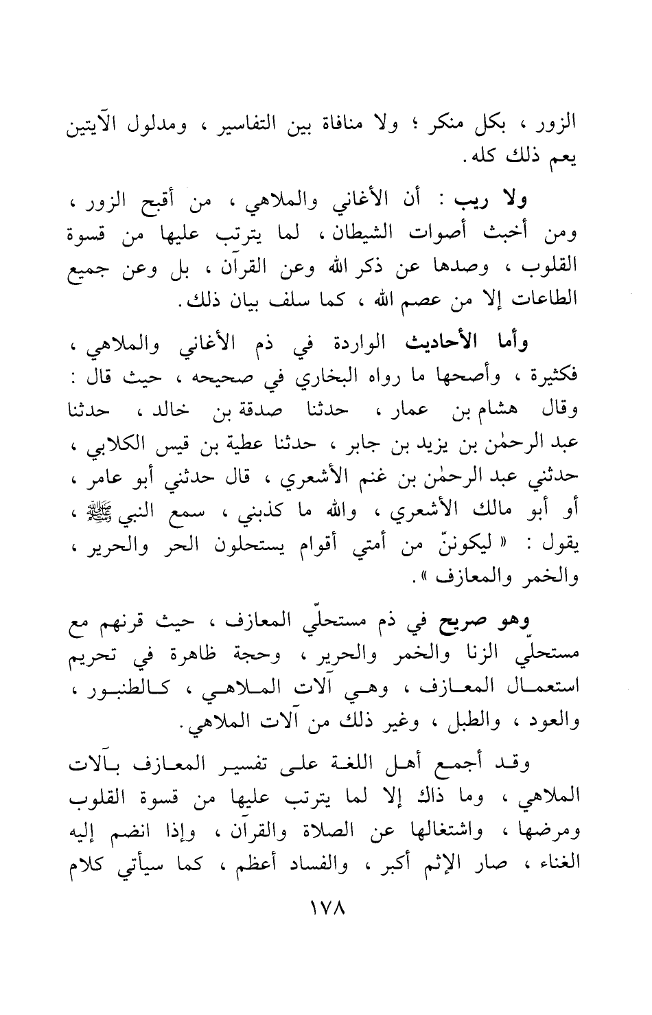 وهو صريح في ذم مستحلي المعازف، حيث قرنهم مع مستحلي الزنى والخمر والحرير، وحجة ظاهرة في تحريم استعمال المعازف، وهي آلات الملاهي، كالطنبور، والعود، والطبل، وغير ذلك من آلات الملاهي.