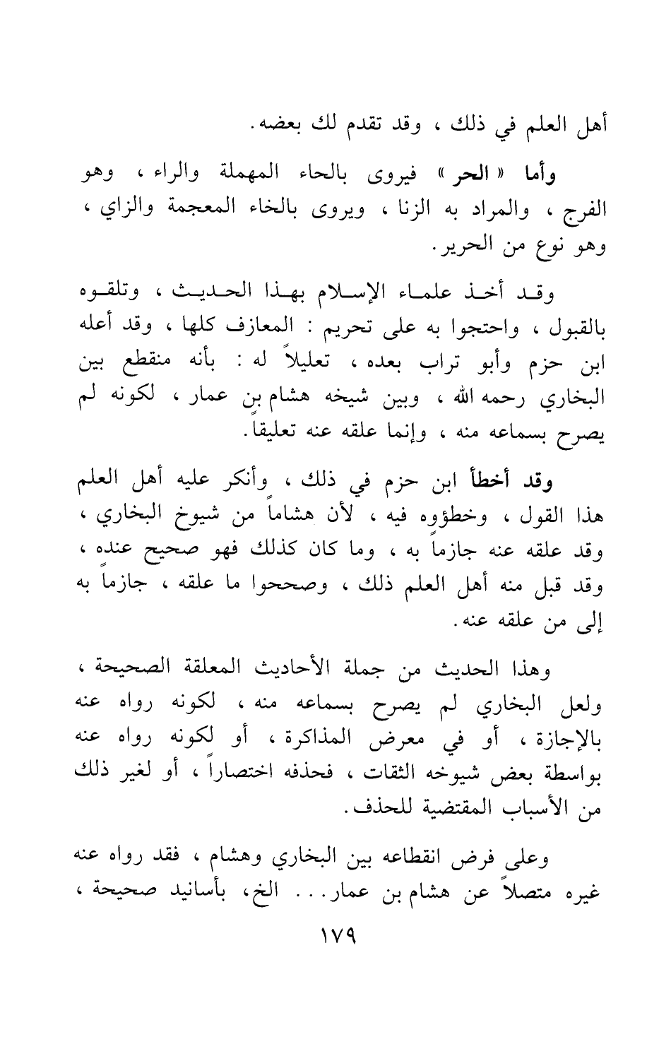 وقد أخطأ ابن حزم في ذلك، وأنكر عليه أهل العلم هذا القول، وخطؤوه فيه، لأن هشاما من شيوخ البخاري، وقد علقه عنه جازما به، وما كان كذلك فهو صحيح عنده؛ وقد قبل منه أهل العلم ذلك، وصححوا ما علقه جازما به إلى من علقه عنه.