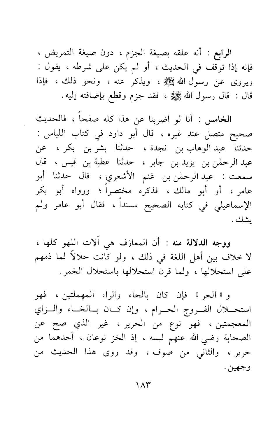 ووجه الدلالة منه: أن المعازف هي آلات اللهو كلها، لا خلاف بين أهل اللغة في ذلك، ولو كانت حلالا لما ذمهم على استحلالها، ولما قرن استحلالها باستحلال الخمر.