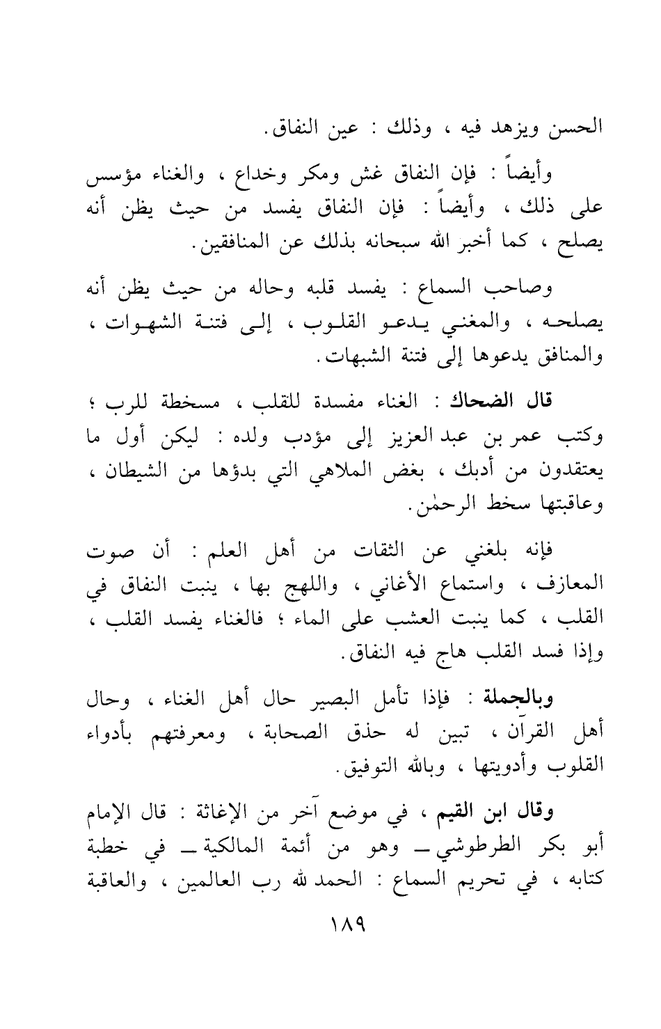 فإنه بلغني عن الثقات من أهل العلم أن صوت المعازف، واستماع الأغاني، واللهج بها، ينبت النفاق في القلب، كما ينبت العشب على الماء فالغناء يفسد القلب، وإذا فسد القلب هاج فيه النفاق.