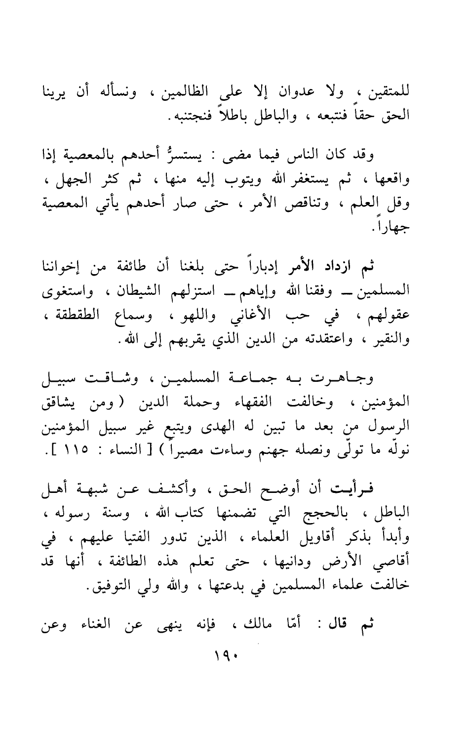 وجاهرت به جماعة المسلمين، وشاقت سبيل المؤمنين، وخالفت الفقهاء وحملة الدين {وَمَنْ يُشَاقِقِ الرَّسُولَ مِنْ بَعْدِ مَا تَبَيَّنَ لَهُ الْهُدَى وَيَتَّبِعْ غَيْرَ سَبِيلِ الْمُؤْمِنِينَ نُوَلِّهِ مَا تَوَلَّى وَنُصْلِهِ جَهَنَّمَ وَسَاءَتْ مَصِيراً} [سورة النساء آية: 115] .