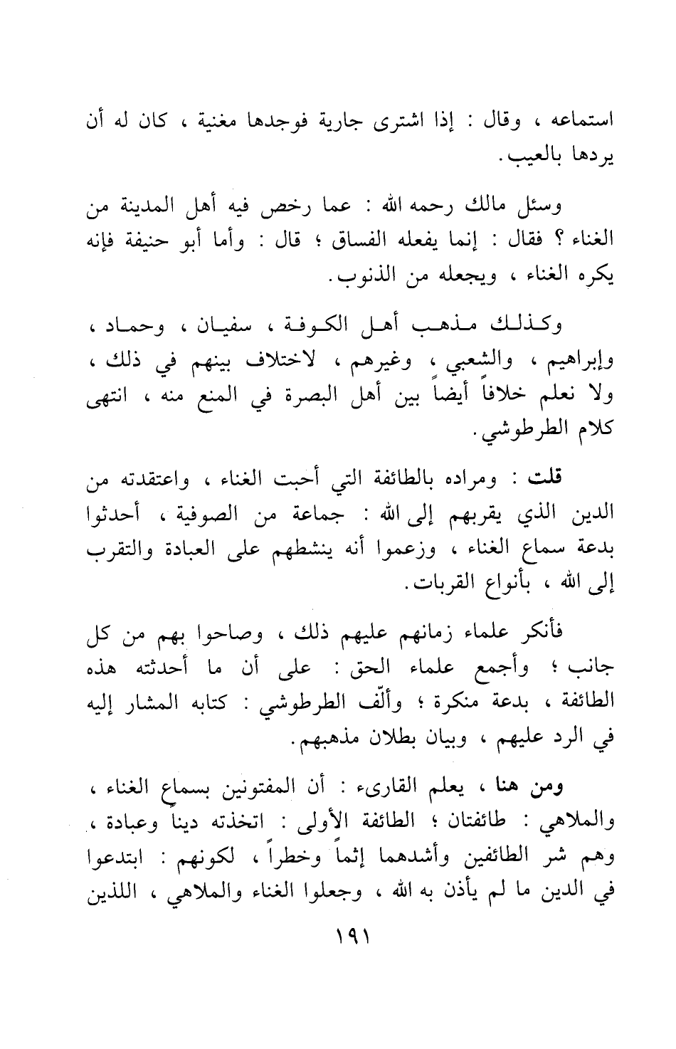 قلت: ومراده بالطائفة التي أحبت الغناء، واعتقدته من الدين الذي يقربهم إلى الله: جماعة من الصوفية، أحدثوا بدعة سماع الغناء، وزعموا أنه ينشطهم على العبادة والتقرب إلى الله بأنواع القربات.