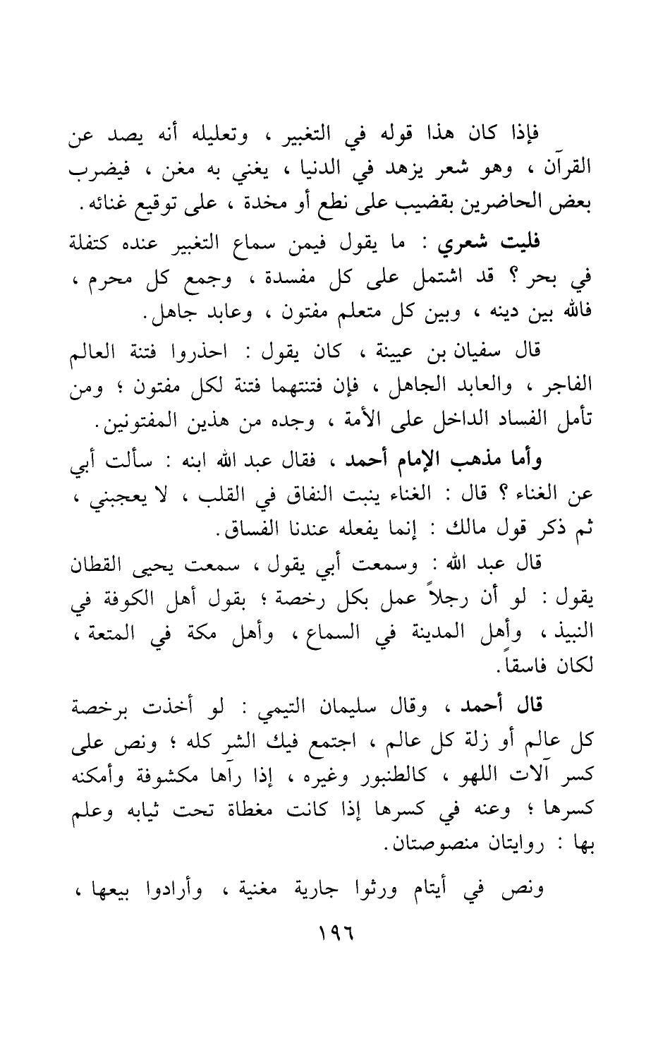 قال أحمد: وقال سليمان التيمي: "لو أخذت برخصة كل عالم أو زلة كل عالم، اجتمع فيك الشر كله"، ونص على كسر آلات اللهو، كالطنبور وغيره، إذا رآها مكشوفة وأمكنه كسرها; وعنه في كسرها إذا كانت مغطاة تحت ثيابه وعلم بها روايتان منصوصتان.