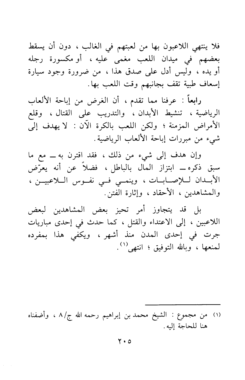 رابعا: عرفنا مما تقدم، أن الغرض من إباحة الألعاب الرياضية، تنشيط الأبدان، والتدريب على القتال، وقلع الأمراض المزمنة، ولكن اللعب بالكرة الآن لا يهدف إلى شيء من مبررات إباحة الألعاب الرياضية.