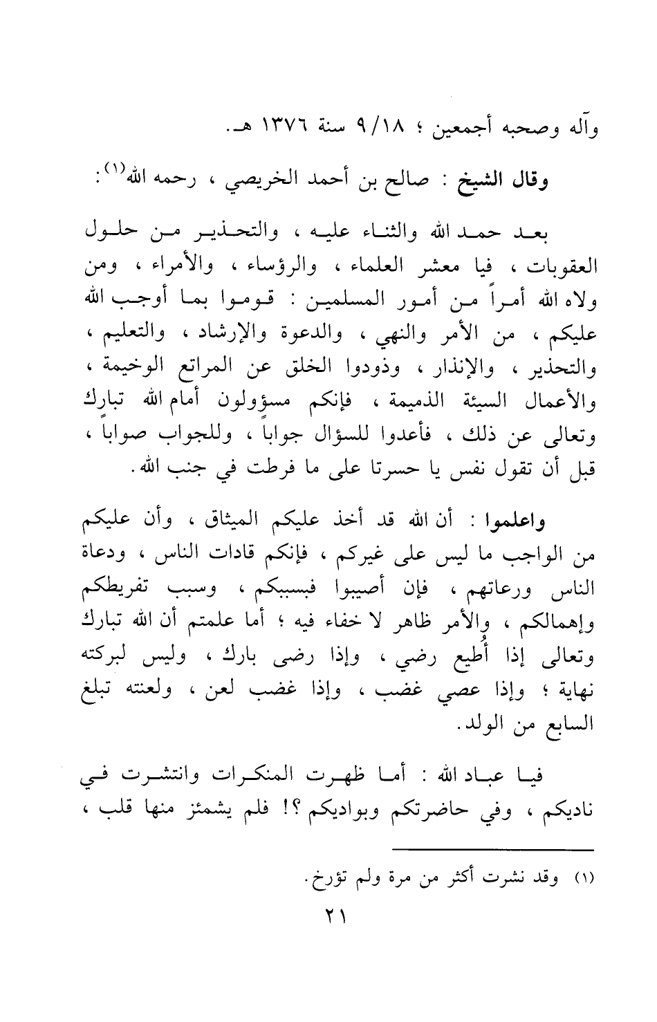 [حث الشيخ صالح الخريصي العلماء والرؤساء على القيام بما أوجب الله عليهم من الأمر والنهي]