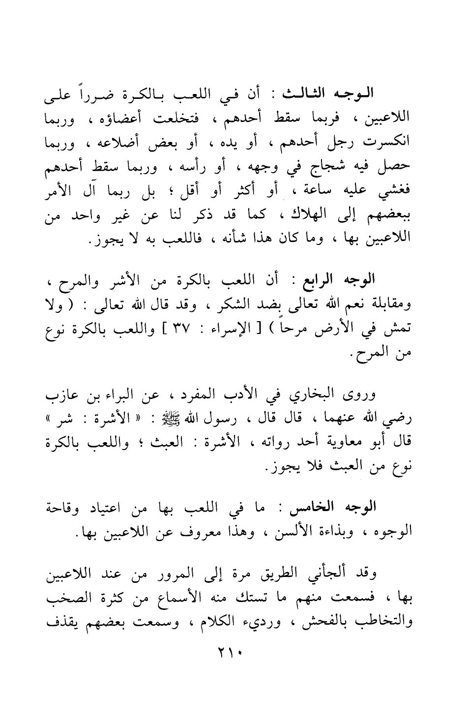 الوجه الرابع: أن اللعب بالكرة من الأشر والمرح، ومقابلة نعم الله تعالى بضد الشكر، وقد قال الله تعالى: {وَلا تَمْشِ فِي الْأَرْضِ مَرَحاً} [سورة الإسراء آية: 37] ، واللعب بالكرة نوع من المرح.