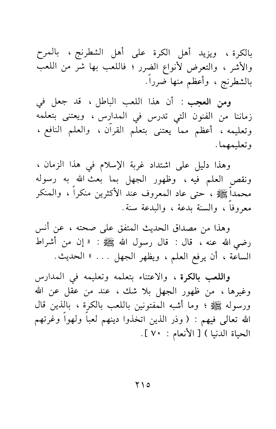 واللعب بالكرة، والاعتناء بتعلمه وتعليمه في المدارس وغيرها، من ظهور الجهل بلا شك، عند من عقل عن الله ورسوله صلى الله عليه وسلم. وما أشبه المفتونين باللعب بالكرة، بالذين قال الله تعالى فيهم: {وَذَرِ الَّذِينَ اتَّخَذُوا دِينَهُمْ لَعِباً وَلَهْواً وَغَرَّتْهُمُ الْحَيَاةُ الدُّنْيَا} 2.