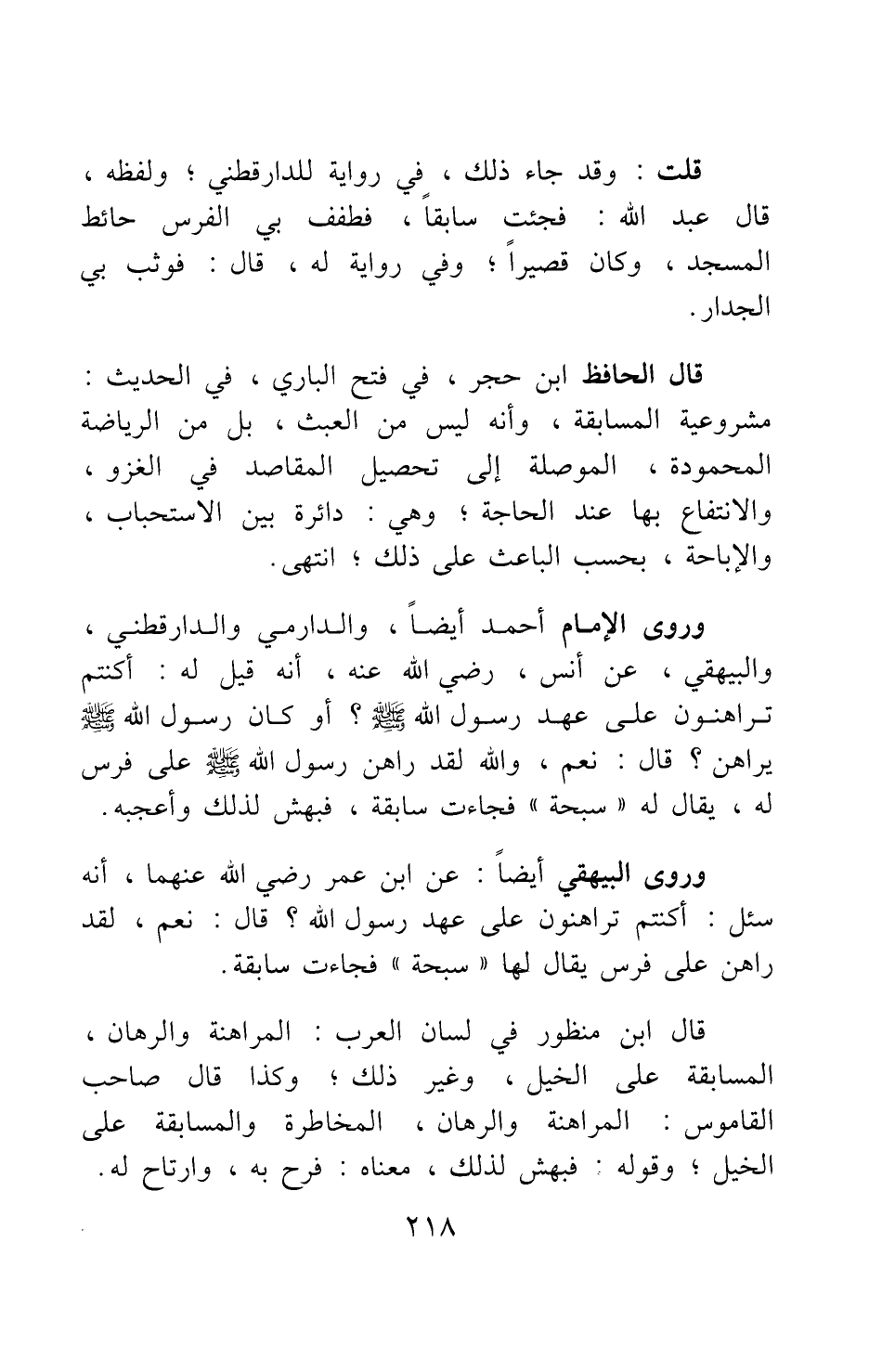 وروى البيهقي أيضا عن ابن عمر رضي الله عنهما، أنه سئل: "أكنتم تراهنون على عهد رسول الله؟ قال: نعم، لقد راهن على فرس يقال لها "سبحة"، فجاءت سابقة" 2.
