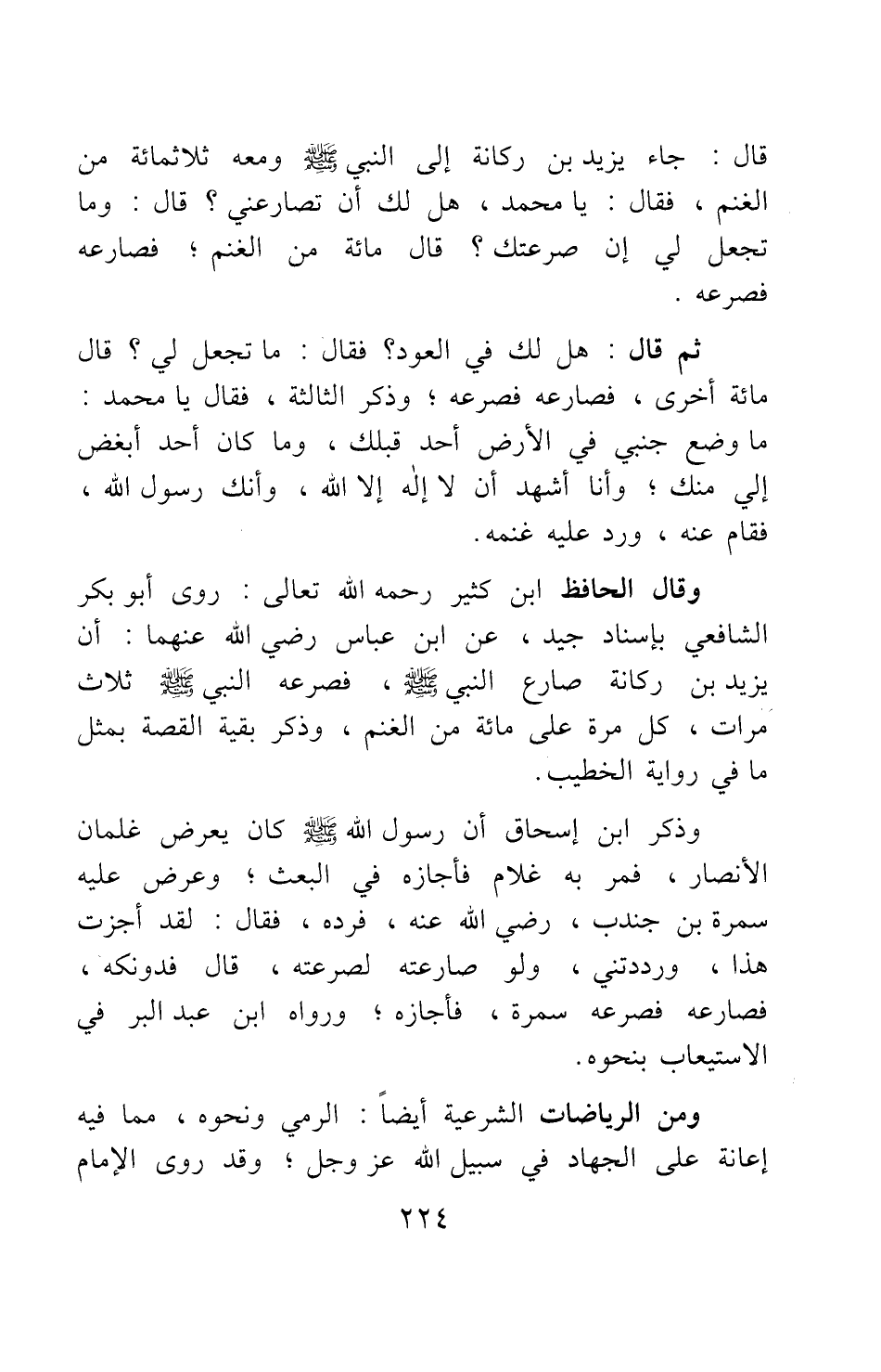 قال: "جاء يزيد بن ركانة إلى النبي صلى الله عليه وسلم ومعه ثلاثمائة من الغنم، فقال: يا محمد، هل لك أن تصارعني؟ قال: وما تجعل لي إن صرعتك؟ قال: مائة من الغنم، فصارعه فصرعه.