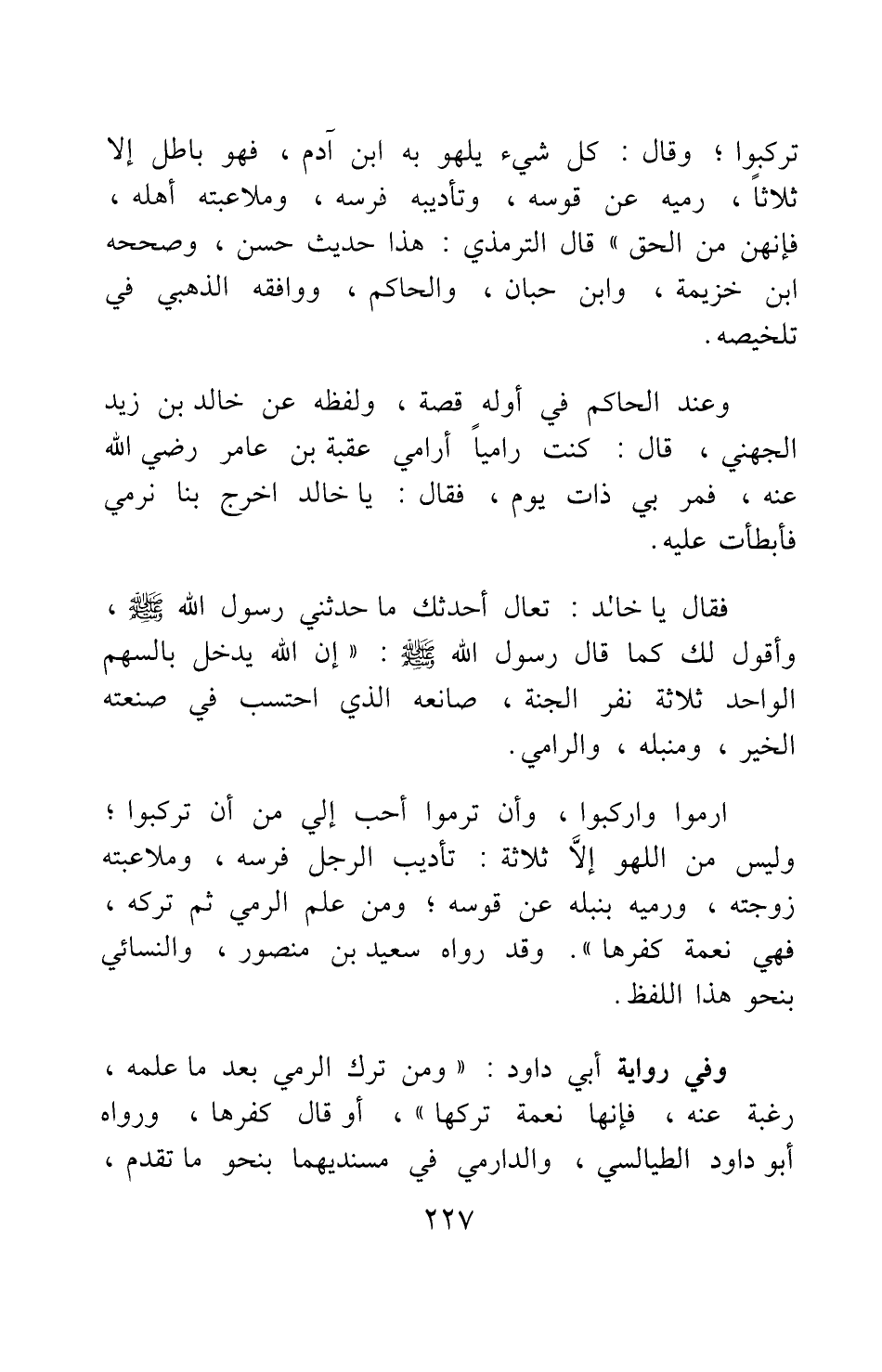 ارموا واركبوا، وأن ترموا أحب إلي من أن تركبوا، وليس من اللهو إلا ثلاثة: تأديب الرجل فرسه، وملاعبته زوجته، ورميه بنبله عن قوسه، ومن علم الرمي ثم تركه، فهي نعمة كفرها" وقد رواه سعيد بن منصور، والنسائي بنحو هذا اللفظ.
