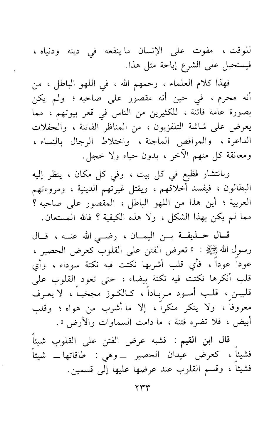 فهذا كلام العلماء، رحمهم الله، في اللهو الباطل، من أنه محرم، في حين أنه مقصور على صاحبه، ولم يكن بصورة عامة فاتنة، للكثيرين من الناس في قعر بيوتهم، مما يعرض على شاشة التلفزيون، من المناظر الفاتنة، والحفلات الداعرة، والمراقص الماجنة، واختلاط الرجال بالنساء، ومعانقة كل منهم الآخر، بدون حياء ولا خجل.
