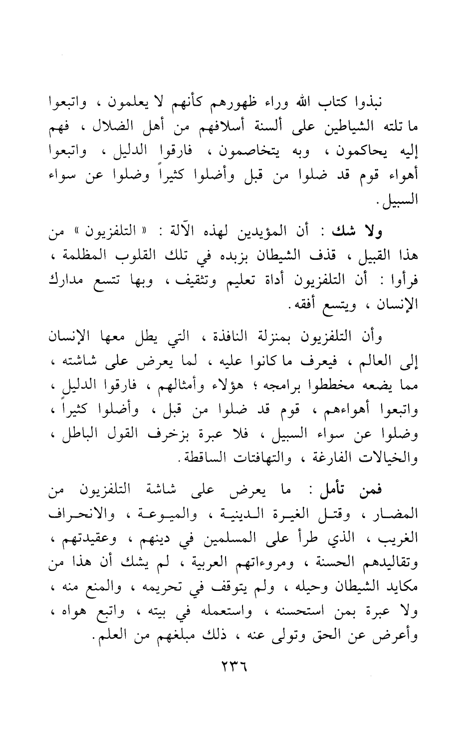 فمن تأمل ما يعرض على شاشة التلفزيون من المضار، وقتل الغيرة الدينية، والميوعة، والانحراف الغريب، الذي طرأ على المسلمين في دينهم، وعقيدتهم، وتقاليدهم الحسنة، ومروءاتهم العربية، لم يشك أن هذا من مكايد الشيطان وحيله، ولم يتوقف في تحريمه، والمنع منه؛ ولا عبرة بمن استحسنه، واستعمله في بيته، واتبع هواه، وأعرض عن الحق وتولى عنه؛ ذلك مبلغهم من العلم.