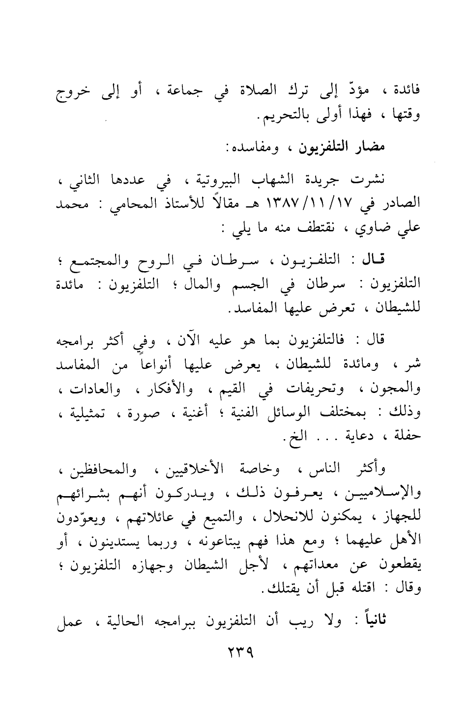 نشرت جريدة الشهاب البيروتية، في عددها الثاني، الصادر في 17/11/1387هـ مقالا للأستاذ المحامي: محمد علي ضاوي، نقتطف منه ما يلي: قال: التلفزيون: سرطان في الروح والمجتمع; التلفزيون: سرطان في الجسم والمال؛ التلفزيون: مائدة للشيطان، تعرض عليها المفاسد.