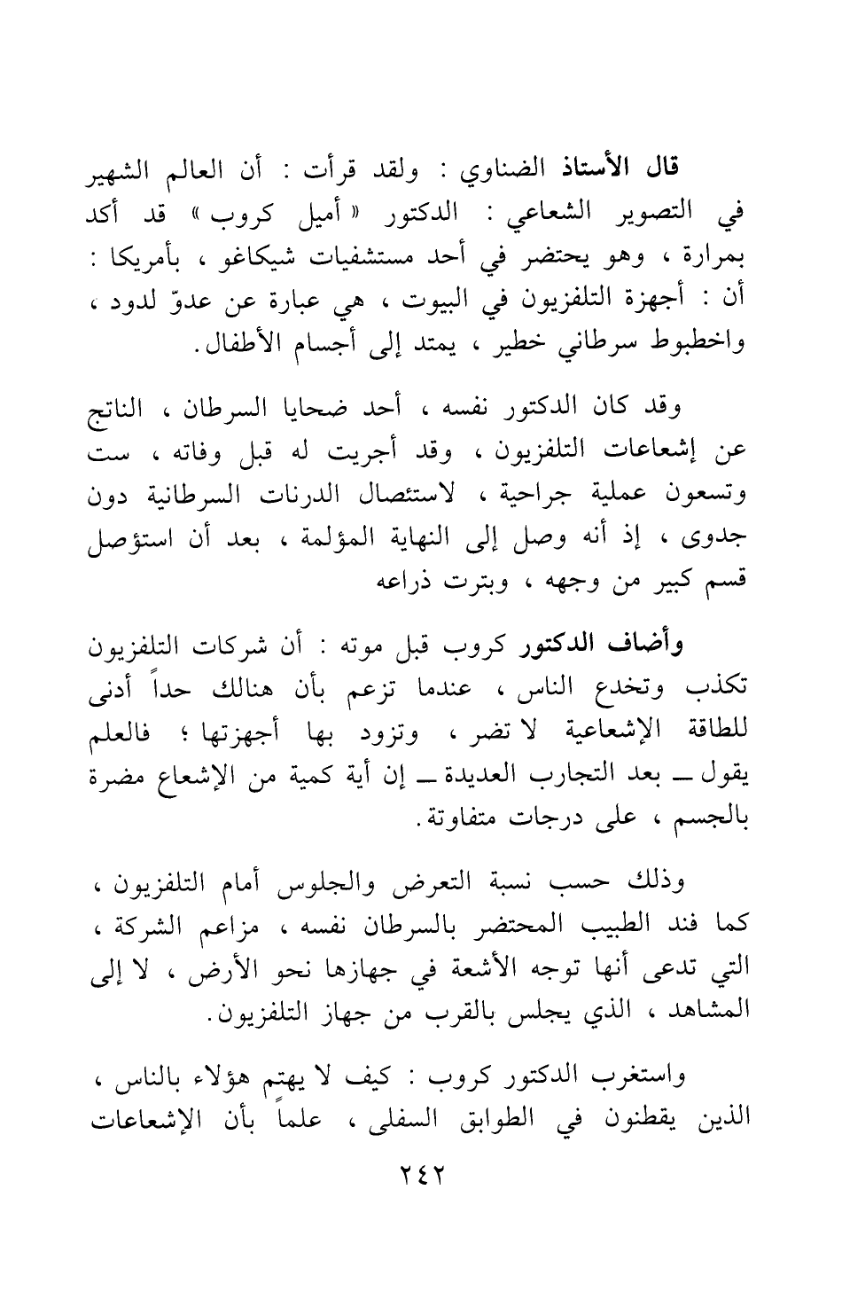 قال الأستاذ الضناوي: ولقد قرأت أن العالم الشهير في التصوير الشعاعي: الدكتور "أميل كروب" قد أكد بمرارة، وهو يحتضر في أحد مستشفيات شيكاغو، بأمريكا: أن أجهزة التلفزيون في البيوت، هي عبارة عن عدو لدود، وأخطبوط سرطاني خطير، يمتد إلى أجسام الأطفال.