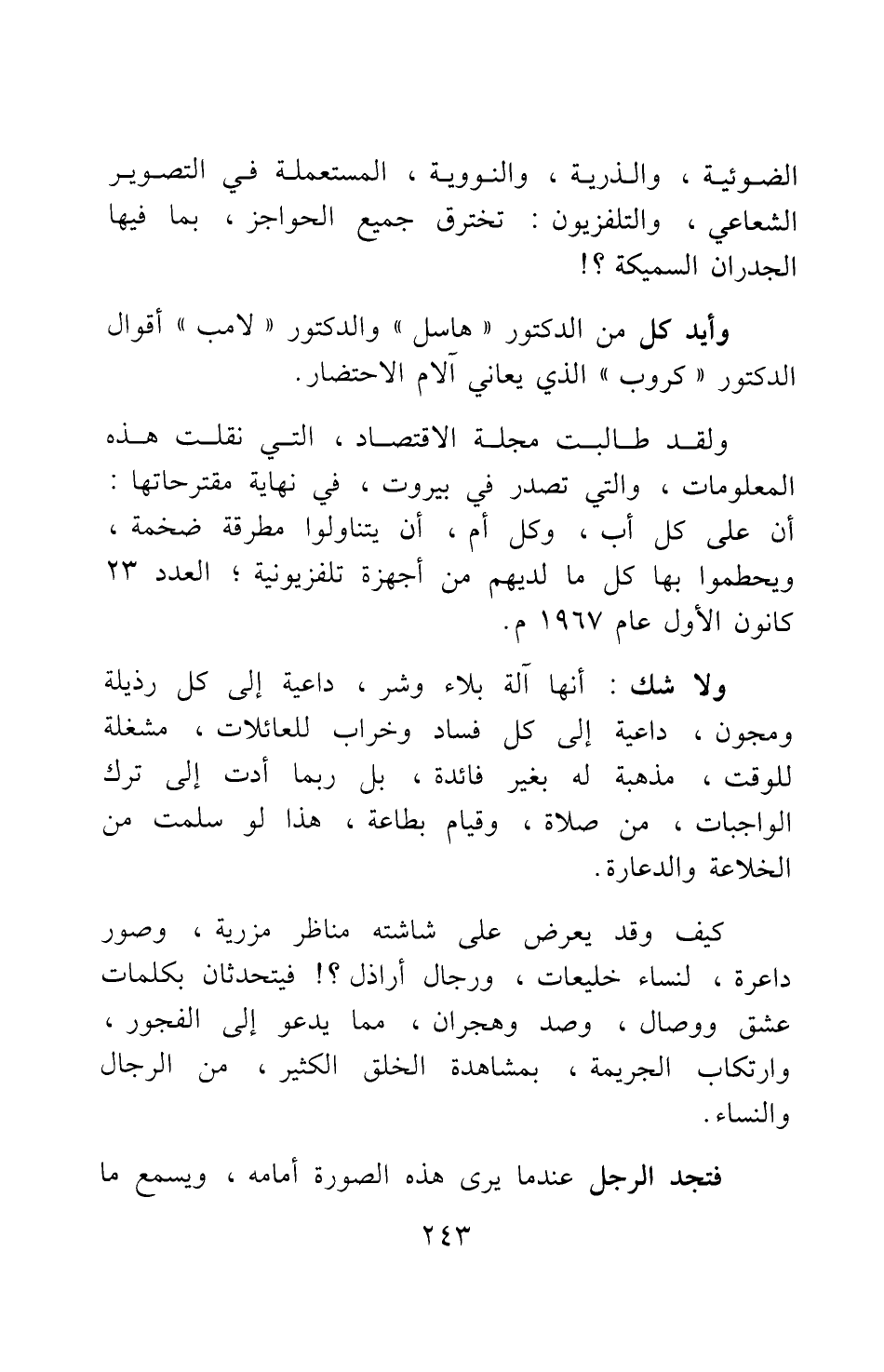 ولقد طالبت مجلة الاقتصاد، التي نقلت هذه المعلومات، والتي تصدر في بيروت، في نهاية مقترحاتها: أن على كل أب، وكل أم، أن يتناولوا مطرقة ضخمة، ويحطموا بها كل ما لديهم من أجهزة تلفزيونية؛ العدد 23 كانون الأول عام 1967 م.