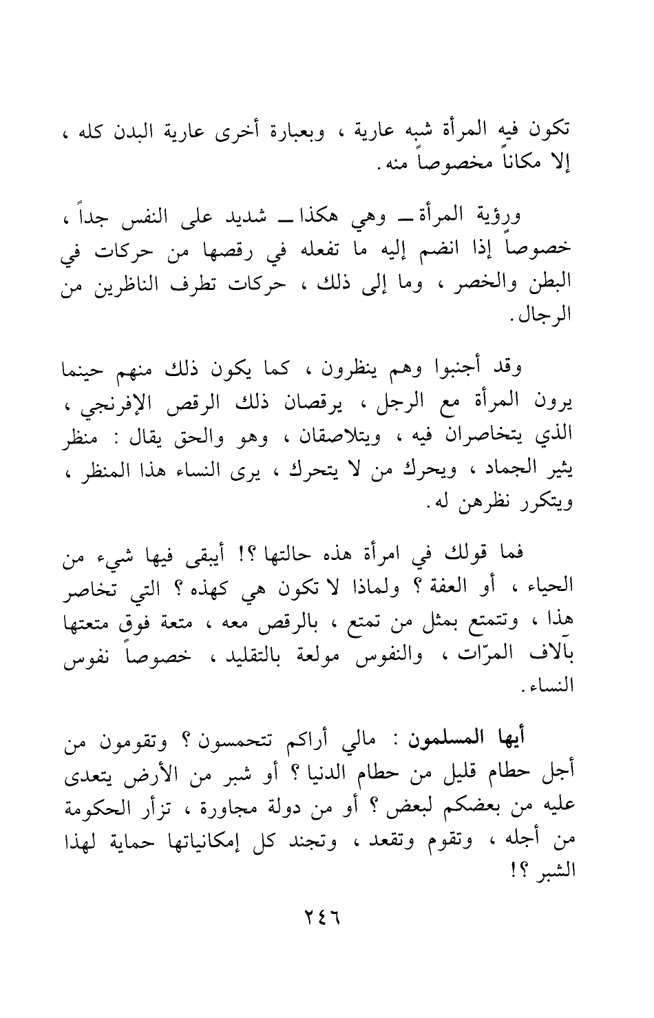 وقد أجنبوا وهم ينظرون، كما يكون ذلك منهم حينما يرون المرأة مع الرجل، يرقصان ذلك الرقص الإفرنجي، الذي يتخاصران فيه، ويتلاصقان، وهو والحق يقال: منظر يثير الجماد، ويحرك من لا يتحرك، يرى النساء هذا المنظر، ويتكرر نظرهن له.