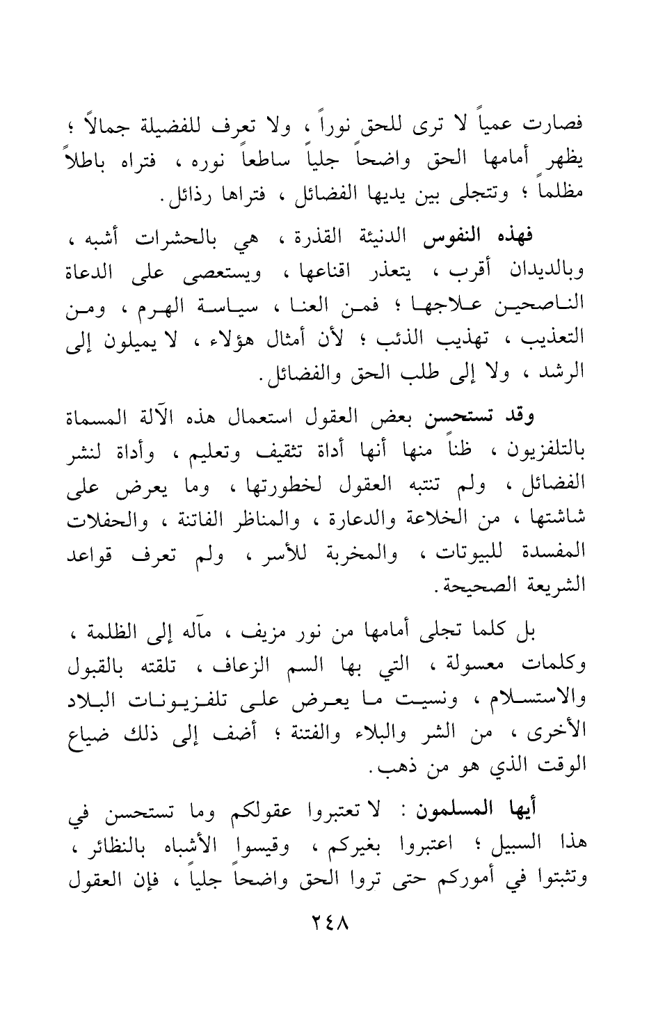 وقد تستحسن بعض العقول استعمال هذه الآلة المسماة بالتلفزيون، ظنا منها أنها أداة تثقيف وتعليم، وأداة لنشر الفضائل، ولم تنتبه العقول لخطورتها، وما يعرض على شاشتها، من الخلاعة والدعارة، والمناظر الفاتنة، والحفلات المفسدة للبيوتات، والمخربة للأسر، ولم تعرف قواعد الشريعة الصحيحة.