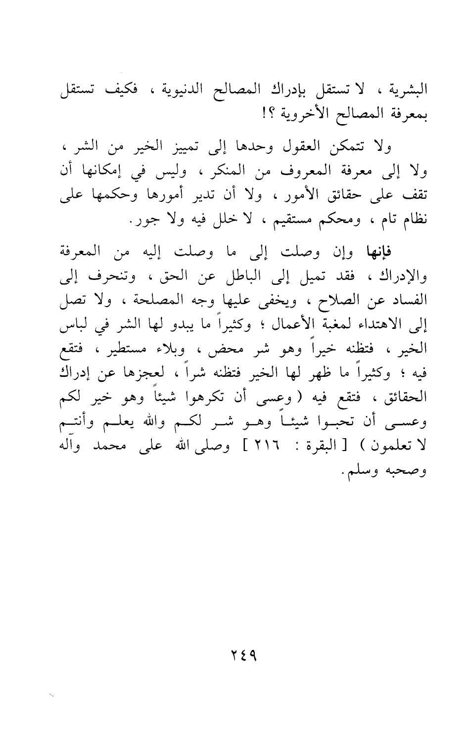 فإنها وإن وصلت إلى ما وصلت إليه من المعرفة والإدراك، فقد تميل إلى الباطل عن الحق، وتنحرف إلى الفساد عن الصلاح، ويخفى عليها وجه المصلحة، ولا تصل إلى الاهتداء لمغبة الأعمال؛ وكثيرا ما يبدو لها الشر في لباس الخير، فتظنه خيرا وهو شر محض، وبلاء مستطير، فتقع فيه؛ وكثيرا ما ظهر لها الخير فتظنه شرا، لعجزها عن إدراك الحقائق، فتقع فيه {وَعَسَى أَنْ تَكْرَهُوا شَيْئاً وَهُوَ خَيْرٌ لَكُمْ وَعَسَى أَنْ تُحِبُّوا شَيْئاً وَهُوَ شَرٌّ لَكُمْ وَاللَّهُ يَعْلَمُ وَأَنْتُمْ لا تَعْلَمُونَ} [سورة البقرة آية: 216] . وصلى الله على محمد وآله وصحبه وسلم.