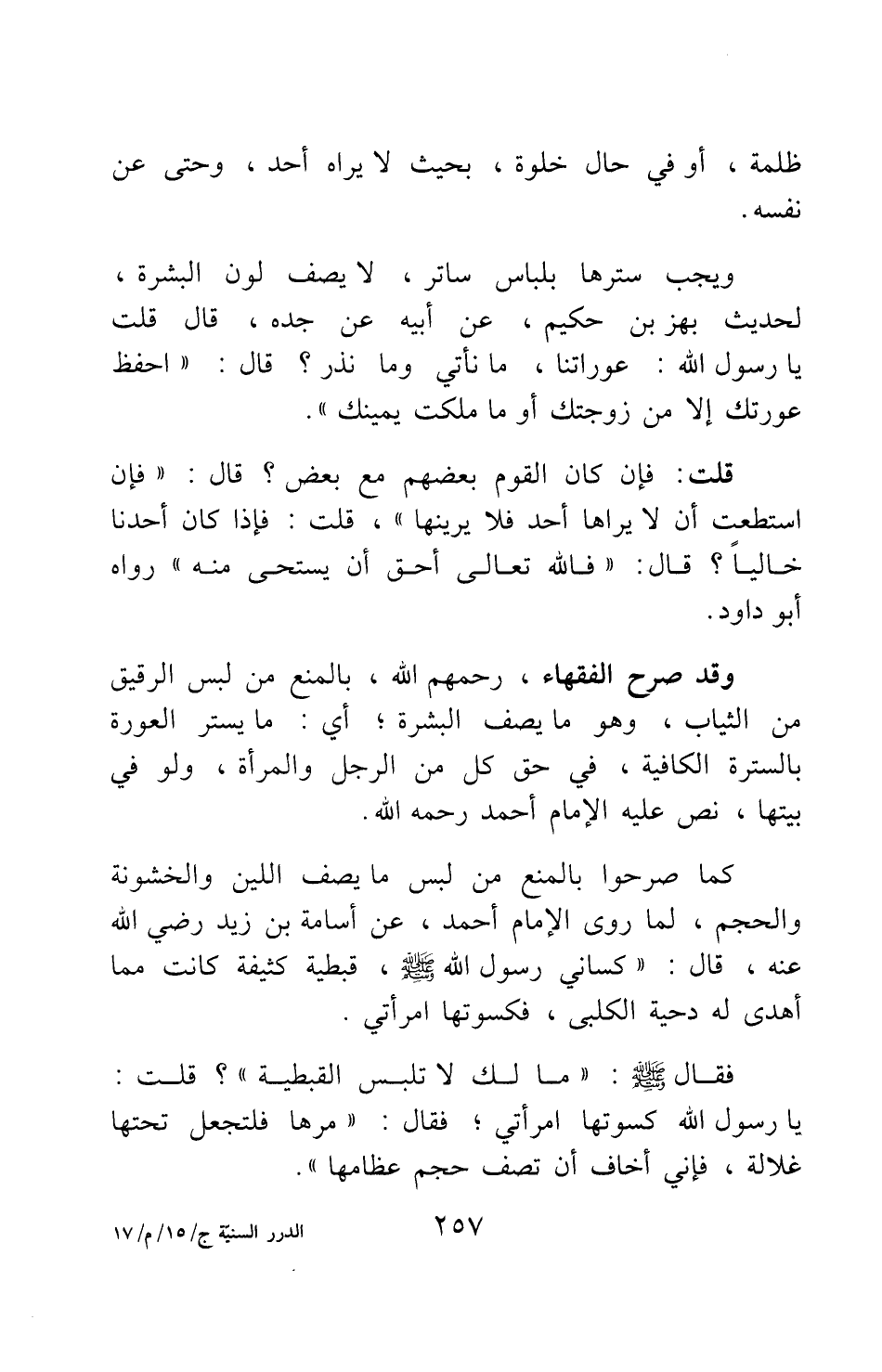 كما صرحوا بالمنع من لبس ما يصف اللين والخشونة والحجم، لما روى الإمام أحمد عن أسامة بن زيد رضي الله عنه قال: "كساني رسول الله صلى الله عليه وسلم قبطية كثيفة كانت مما أهدى له دحية الكلبي، فكسوتها امرأتي. فقال صلى الله عليه وسلم: ما لك لا تلبس القبطية؟ قلت: يا رسول الله كسوتها امرأتي. فقال: مرها فلتجعل تحتها غلالة، فإني أخاف أن تصف حجم عظامها" 2.