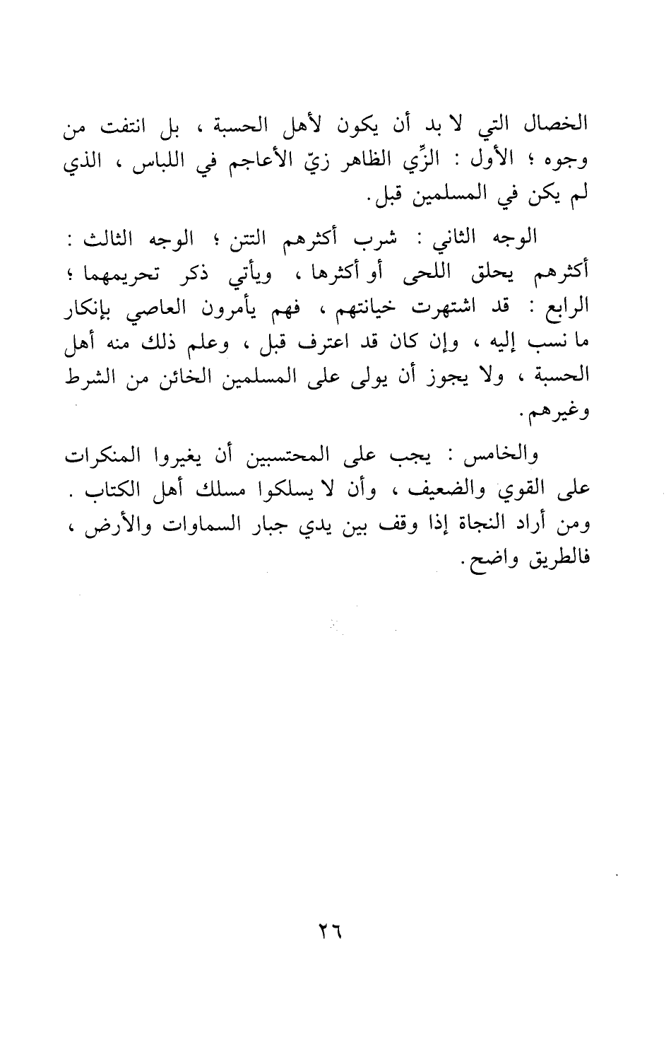 الخصال التي لا بد أن يكون لأهل الحسبة، بل انتفت من وجوه: الأول: الزي الظاهر زي الأعاجم في اللباس، الذي لم يكن في المسلمين قبل.