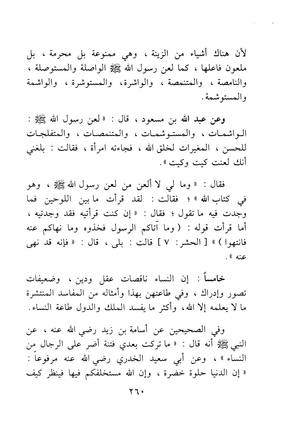 وعن عبد الله بن مسعود، قال: "لعن رسول الله صلى الله عليه وسلم الواشمات، والمستوشمات، والمتنمصات، والمتفلجات للحسن، المغيرات لخلق الله. فجاءته امرأة، فقالت: بلغني أنك لعنت كيت وكيت.