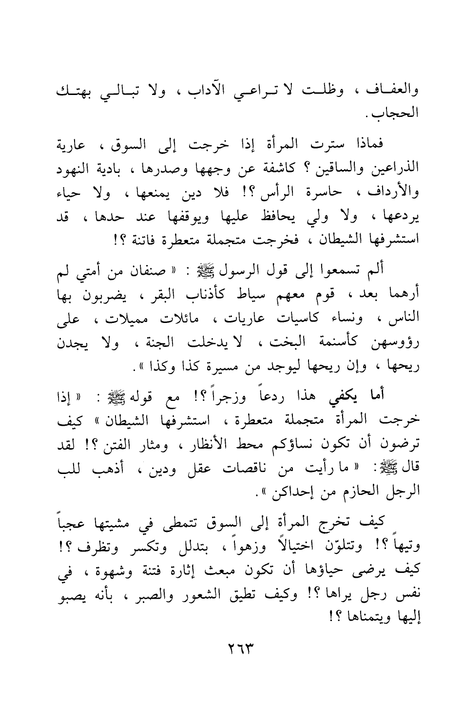 فماذا سترت المرأة إذا خرجت إلى السوق عارية الذراعين والساقين، كاشفة عن وجهها وصدرها، بادية النهود والأرداف، حاسرة الرأس؟! فلا دين يمنعها، ولا حياء يردعها، ولا ولي يحافظ عليها ويوقفها عند حدها؛ قد استشرفها الشيطان، فخرجت متجملة متعطرة فاتنة!