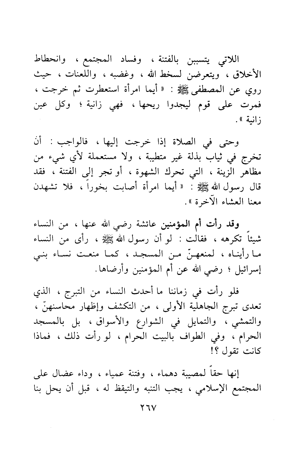 فلو رأت في زماننا ما أحدث النساء من التبرج الذي تعدى تبرج الجاهلية الأولى، من التكشف وإظهار محاسنهن، والتمشي، والتمايل في الشوارع والأسواق، بل بالمسجد الحرام، وفي الطواف بالبيت الحرام، لو رأت ذلك، فماذا كانت تقول؟ !