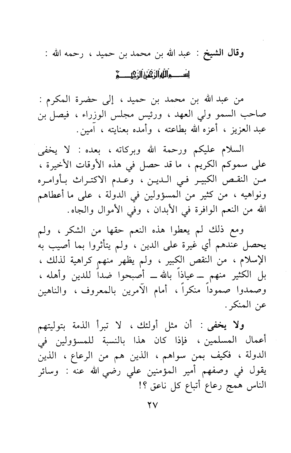 السلام عليكم ورحمة الله وبركاته، بعده: لا يخفى على سموكم الكريم، ما قد حصل في هذه الأوقات الأخيرة، من النقص الكبير في الدين، وعدم الاكتراث بأوامره ونواهيه، من كثير من المسؤولين في الدولة، على ما أعطاهم الله من النعم الوافرة في الأبدان، وفي الأموال والجاه. ومع ذلك لم يعطوا هذه النعم حقها من الشكر، ولم يحصل عندهم أي غيرة على الدين، ولم يتأثروا بما أصيب به الإسلام من النقص الكبير، ولم يظهر منها كراهية لذلك، بل الكثير منهم- عياذا بالله- أصبحوا ضدا للدين وأهله، وصمدوا صمودا منكرا أمام الآمرين بالمعروف والناهين عن المنكر.
