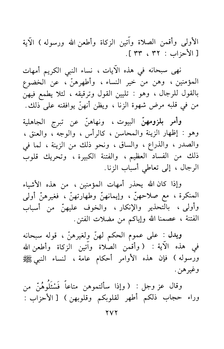 ويدل على عموم الحكم لهن ولغيرهن، قوله سبحانه في هذه الآية: {وَأَقِمْنَ الصَّلاةَ وَآتِينَ الزَّكَاةَ وَأَطِعْنَ اللَّهَ وَرَسُولَهُ} [سورة الأحزاب آية: 33] فإن هذه الأوامر أحكام عامة، لنساء النبي صلى الله عليه وسلم وغيرهن.
