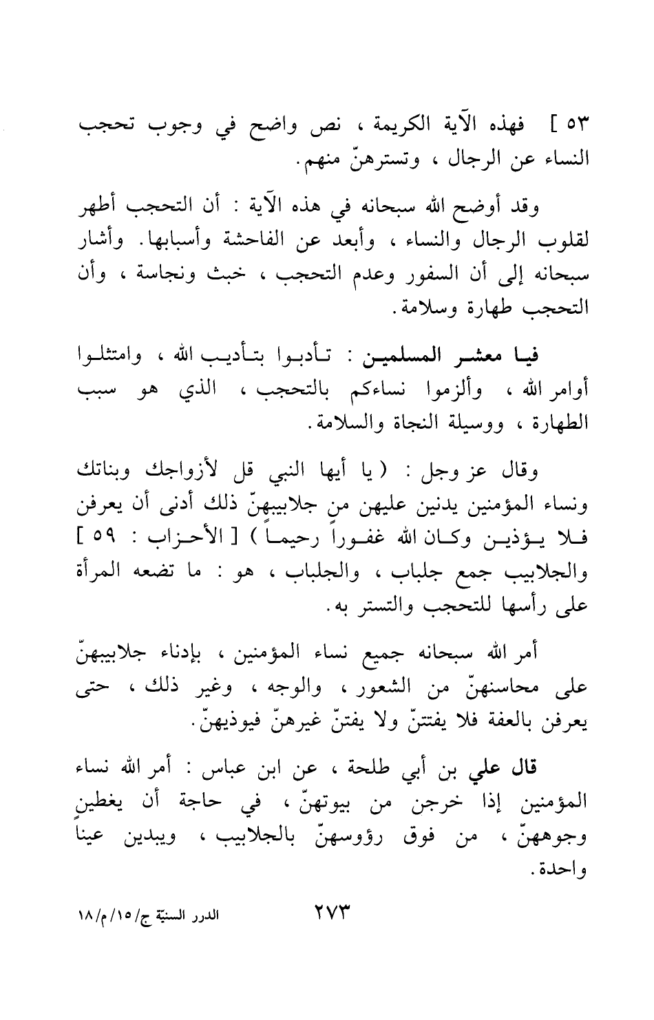 فيا معشر المسلمين، تأدبوا بتأديب الله، وامتثلوا أوامر الله، وألزموا نساءكم بالتحجب الذي هو سبب الطهارة، ووسيلة النجاة والسلامة.