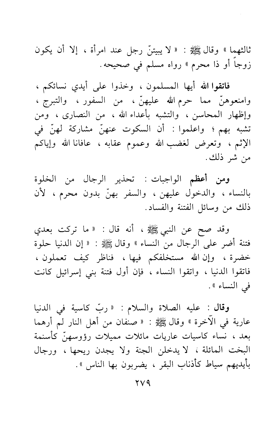 وقد صح عن النبي صلى الله عليه وسلم أنه قال: "ما تركت بعدي فتنة أضر على الرجال من النساء" 3. وقال صلى الله عليه وسلم: "إن الدنيا حلوة خضرة، وإن الله مستخلفكم فيها، فناظر كيف تعملون؛ فاتقوا الدنيا، واتقوا النساء؛ فإن أول فتنة بني إسرائيل كانت في النساء" 4.