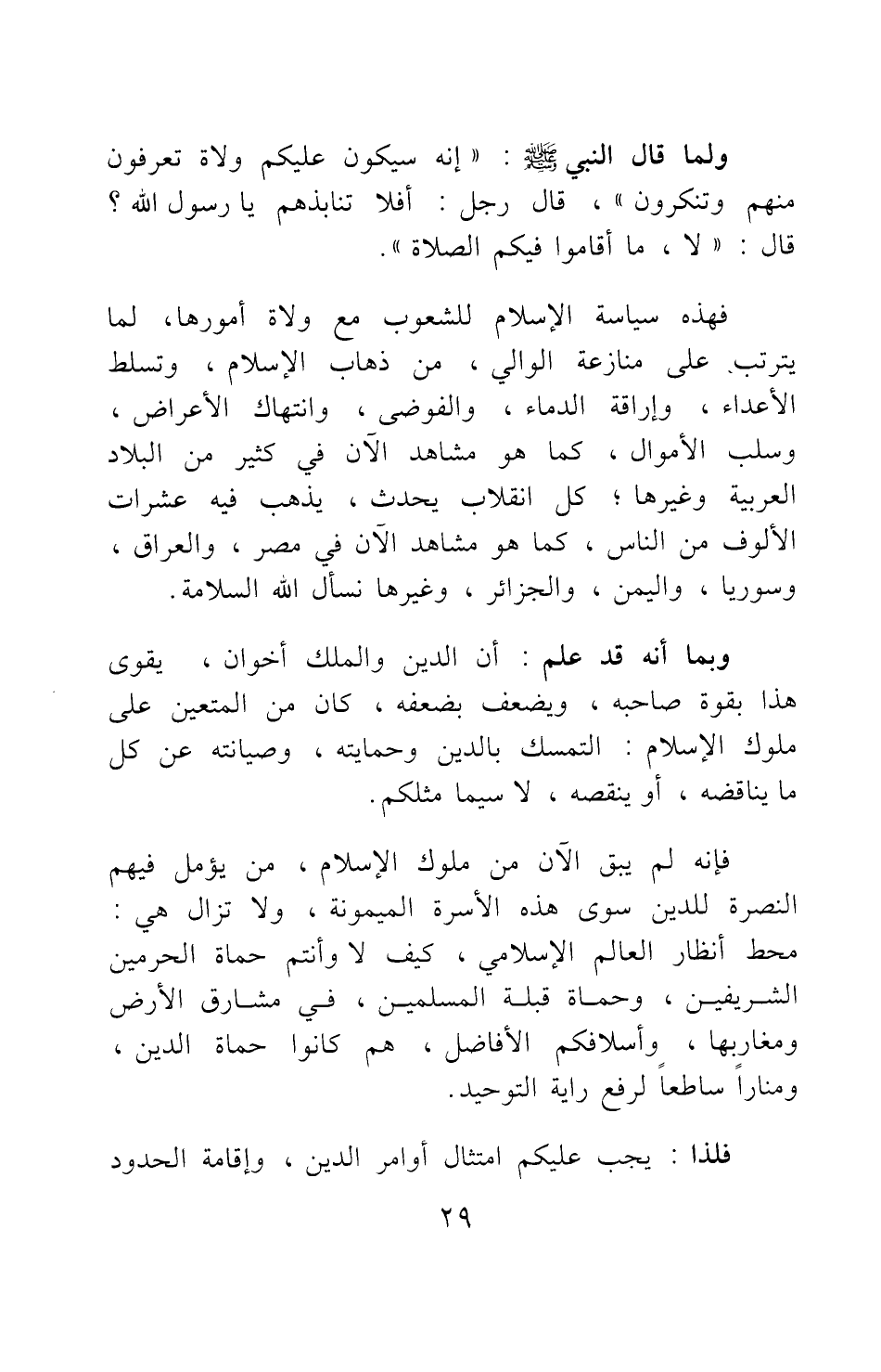 ولما قال النبي صلى الله عليه وسلم: "إنه سيكون عليكم ولاة تعرفون منهم وتنكرون، قال رجل: أفلا تنابذهم يا رسول الله؟ قال: لا، ما أقاموا فيكم الصلاة" 1 فهذه سياسة الإسلام للشعوب مع ولاة أمورها، لما يترتب- على منازعة الوالي من ذهاب الإسلام، وتسلط الأعداء، وإراقة الدماء، والفوضى، وانتهاك الأعراض، وسلب الأموال، كما هو مشاهد الآن في كثير من البلاد العربية وغيرها. كل انقلاب يحدث، يذهب فيه عشرات الألوف من الناس، كما هو مشاهد الآن في مصر، والعراق، وسوريا، واليمن، والجزائر، وغيرها نسأل الله السلامة.