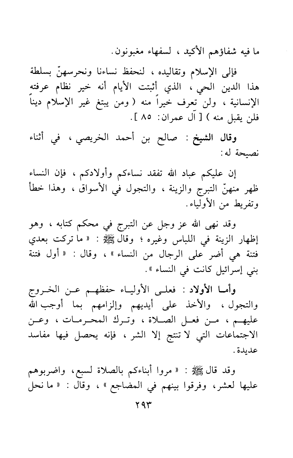 [قول الشيخ صالح بن أحمد الخريصي: إن عليكم عباد الله تفقد نسائكم وأولادكم]