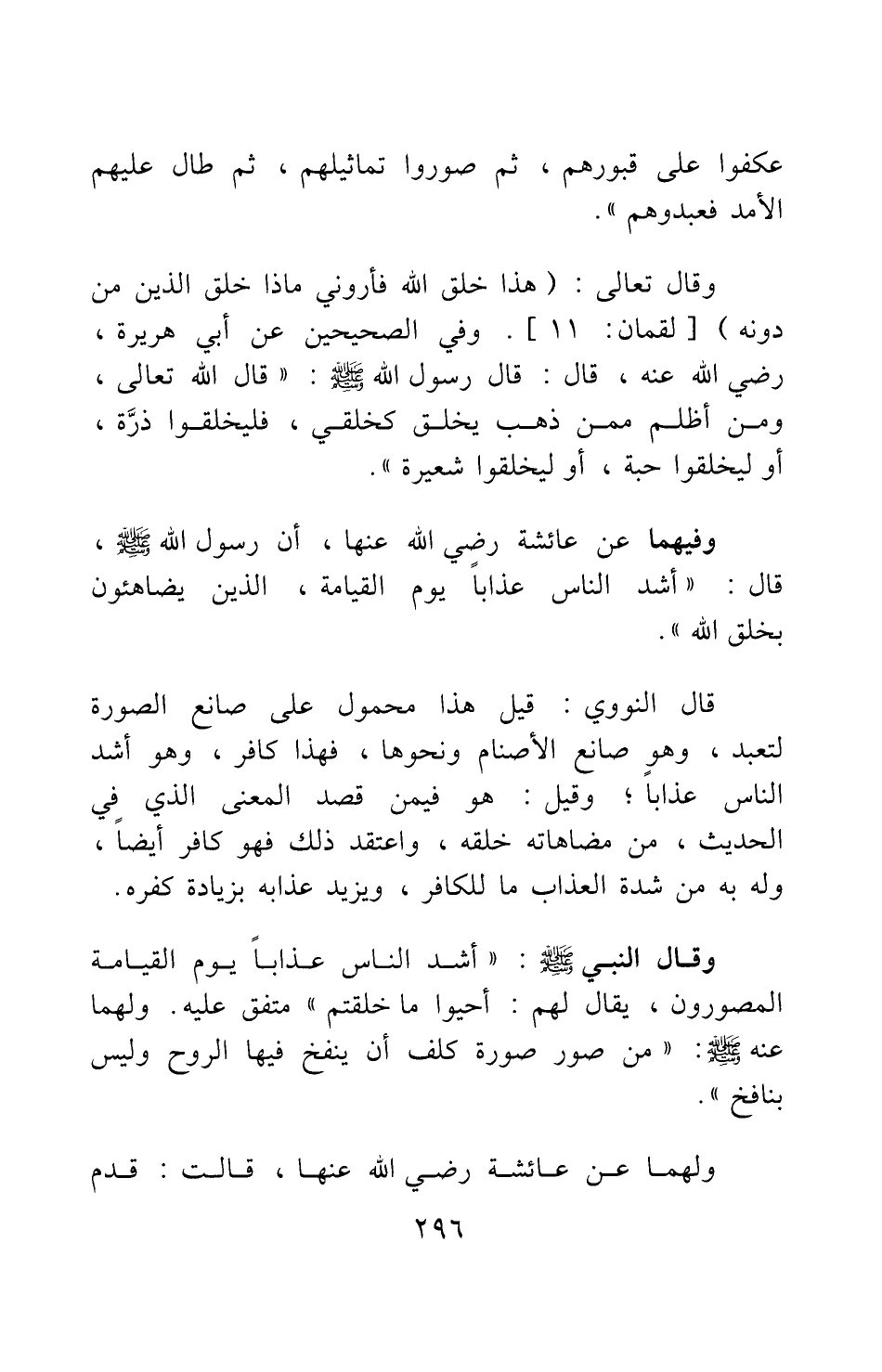 وفيهما عن عائشة رضي الله عنها، أن رسول الله صلى الله عليه وسلم قال: "أشد الناس عذابا يوم القيامة، الذين يضاهئون بخلق الله" 2.
