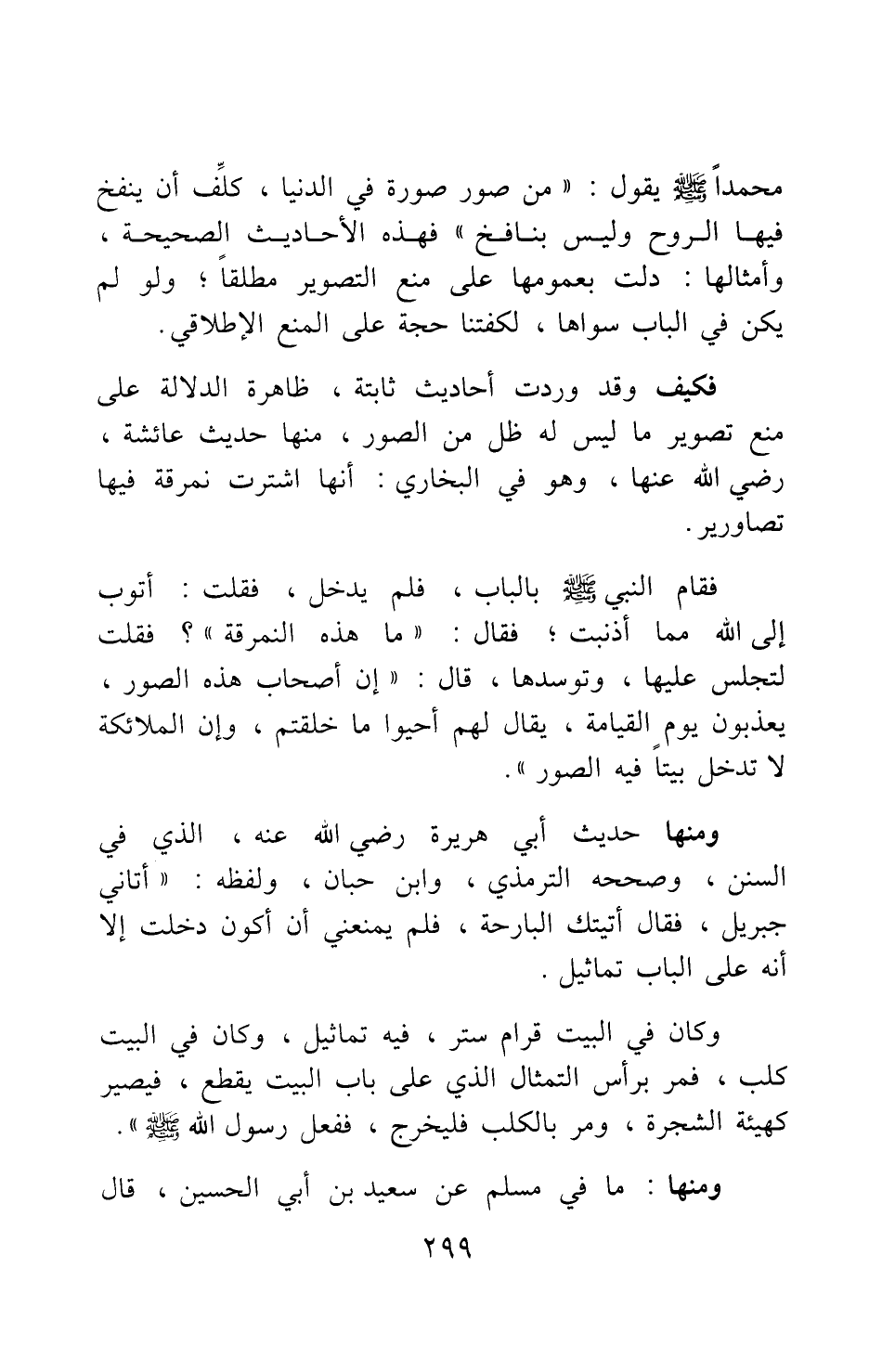 فكيف وقد وردت أحاديث ثابتة، ظاهرة الدلالة على منع تصوير ما ليس له ظل من الصور، منها حديث عائشة، رضي الله عنها، وهو في البخاري: "أنها اشترت نمرقة فيها تصاوير. فقام النبي صلى الله عليه وسلم بالباب، فلم يدخل، فقلت: أتوب إلى الله مما أذنبت. فقال: ما هذه النمرقة؟ فقلت: لتجلس عليها، وتوسدها، قال: إن أصحاب هذه الصور يعذبون يوم القيامة، يقال لهم: أحيوا ما خلقتم، وإن الملائكة لا تدخل بيتا فيه الصور" 2.
