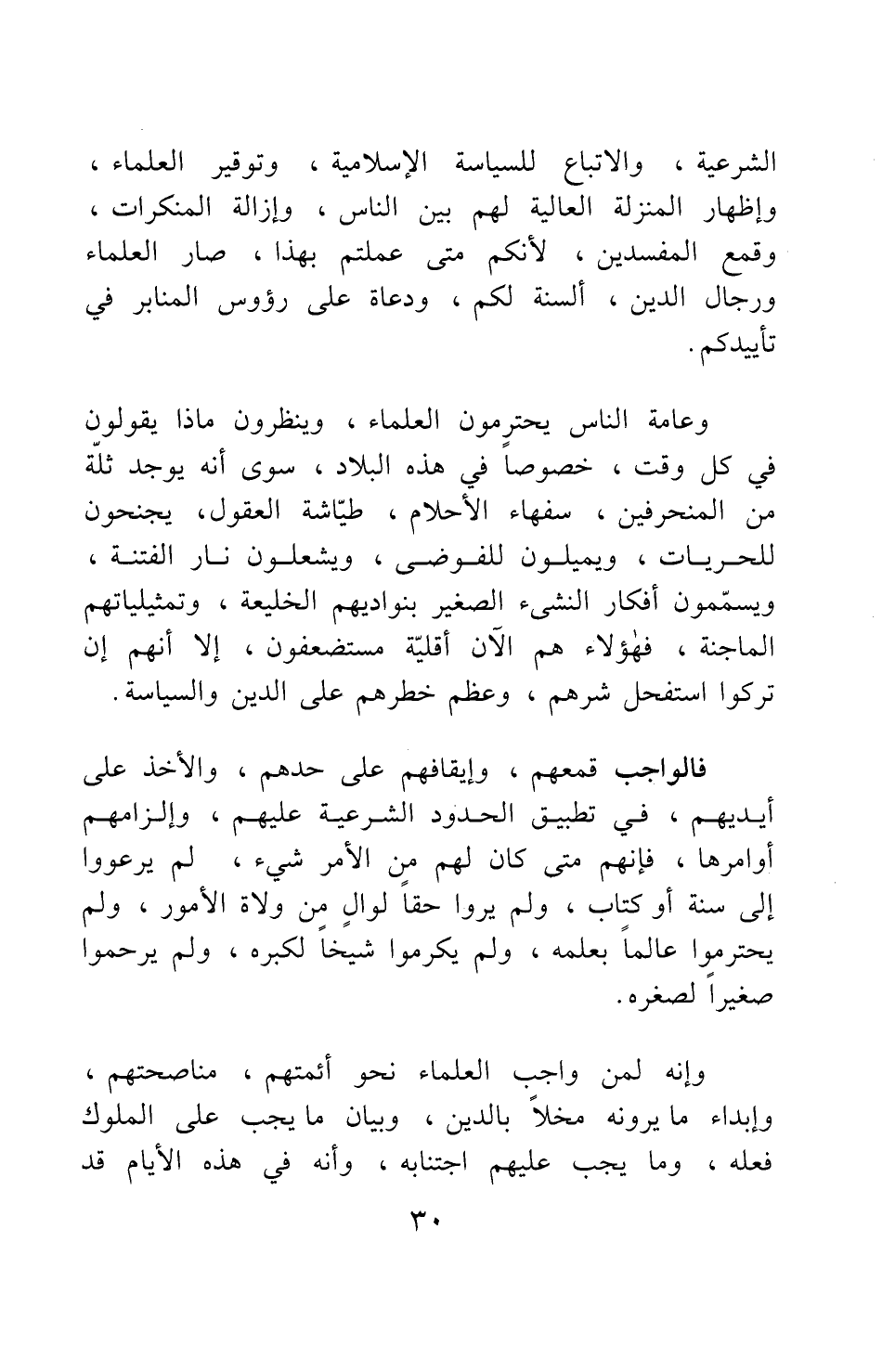 وإنه لمن واجب العلماء نحو أئمتهم، مناصحتهم، وإبداء ما يرونه مخلا بالدين، وبيان ما يجب على الملوك فعله، وما يجب عليهم اجتنابه، وأنه في هذه الأيام قد